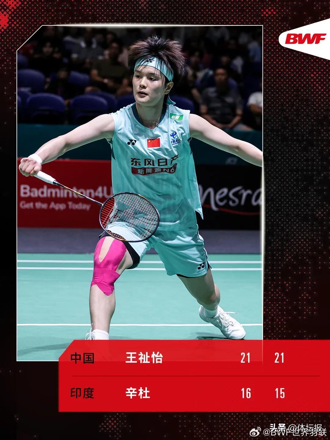 今天進行的半決賽中,國羽女單另一名選手王祉怡2∶0擊敗印度選手辛杜,她將在明天的決賽對陣安洗瑩。王祉怡在本屆比賽狀態火熱,此前以2∶0的大比分先後淘汰了吉爾莫、林湘緹和瓦爾達尼。