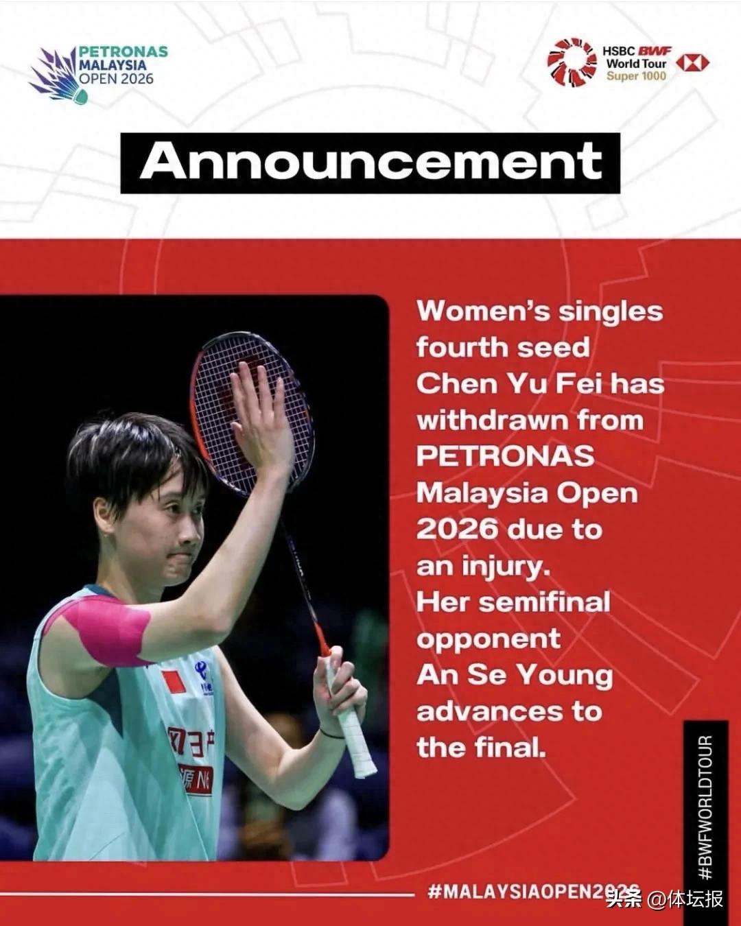 北京時間1月10日,2026年馬來西亞羽毛球公開賽進入半決賽爭奪,中國選手陳雨菲原計劃於上午10點出戰半決賽,對陣韓國選手安洗瑩。賽前陳雨菲退賽,根據世界羽聯發佈的公告,陳雨菲因爲傷病退賽,對手安洗瑩直接晉級決賽。目前未公開具體傷勢細節。