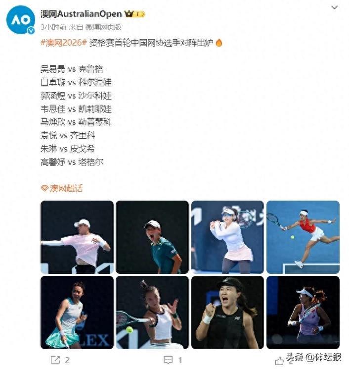 1月11日,2026澳大利亞網球公開賽資格賽籤表公佈。中國網協球員方面,女單出戰7人,爲袁悅、朱琳、郭涵煜、高馨妤、白卓璇、馬燁欣、韋思佳;男單僅浙江選手吳易昺1人出戰。