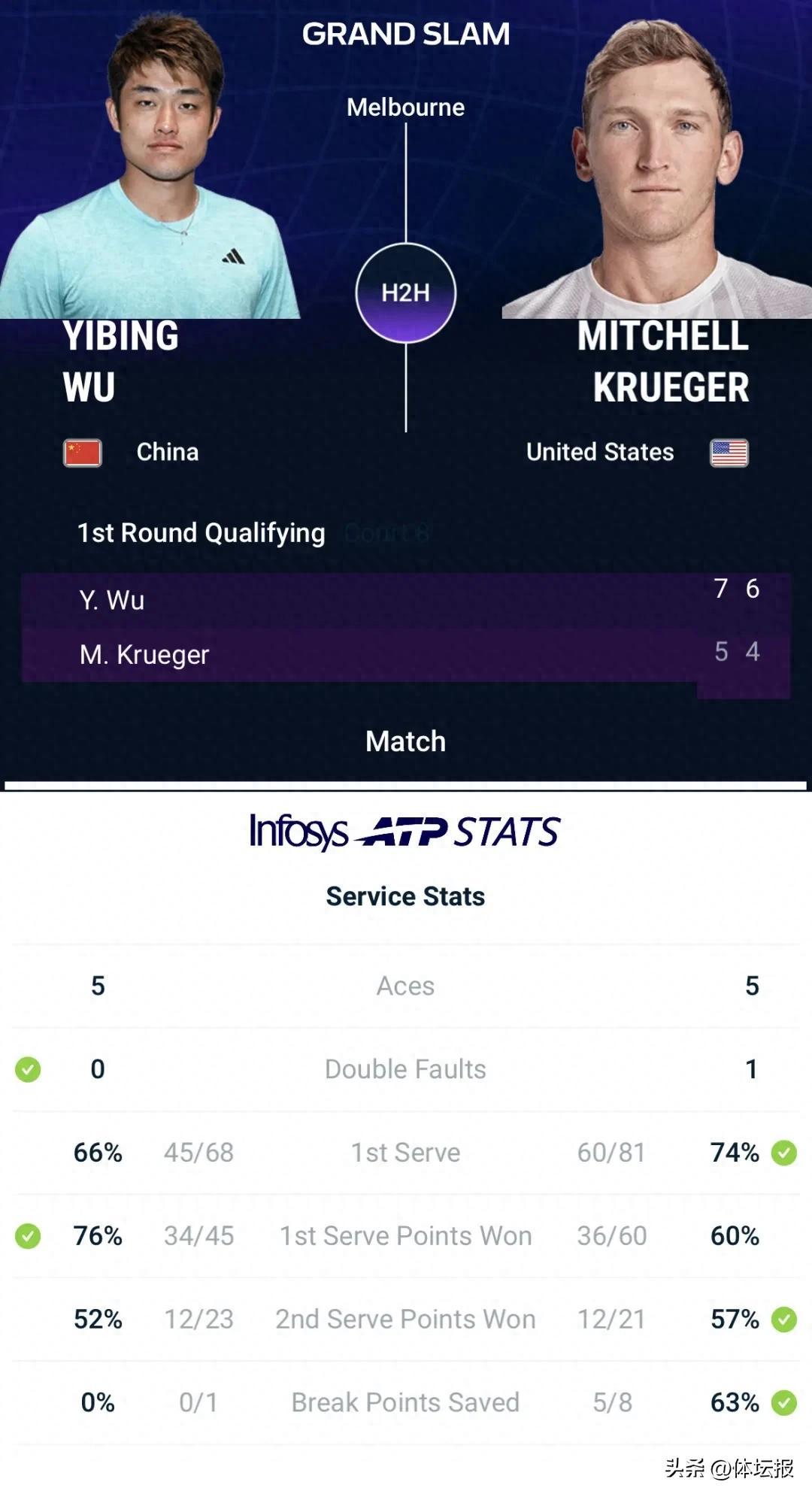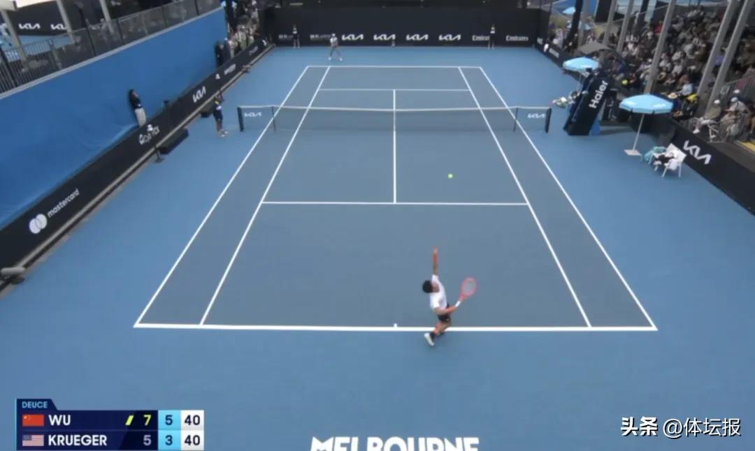 全場比賽吳易昺5個ACE,沒有雙誤,一發得分率高達76%。不僅如此,許多細節也非常值得關注:除了最擅長的正手作爲第一檔武器之外,吳易昺在賽末兩個破發局展現出了反手的接發球強攻和麪對對方大力抽擊回應的反拍切削。穿越球成功率雖不算高,但嘗試次數多,關鍵時刻也有成功案例。