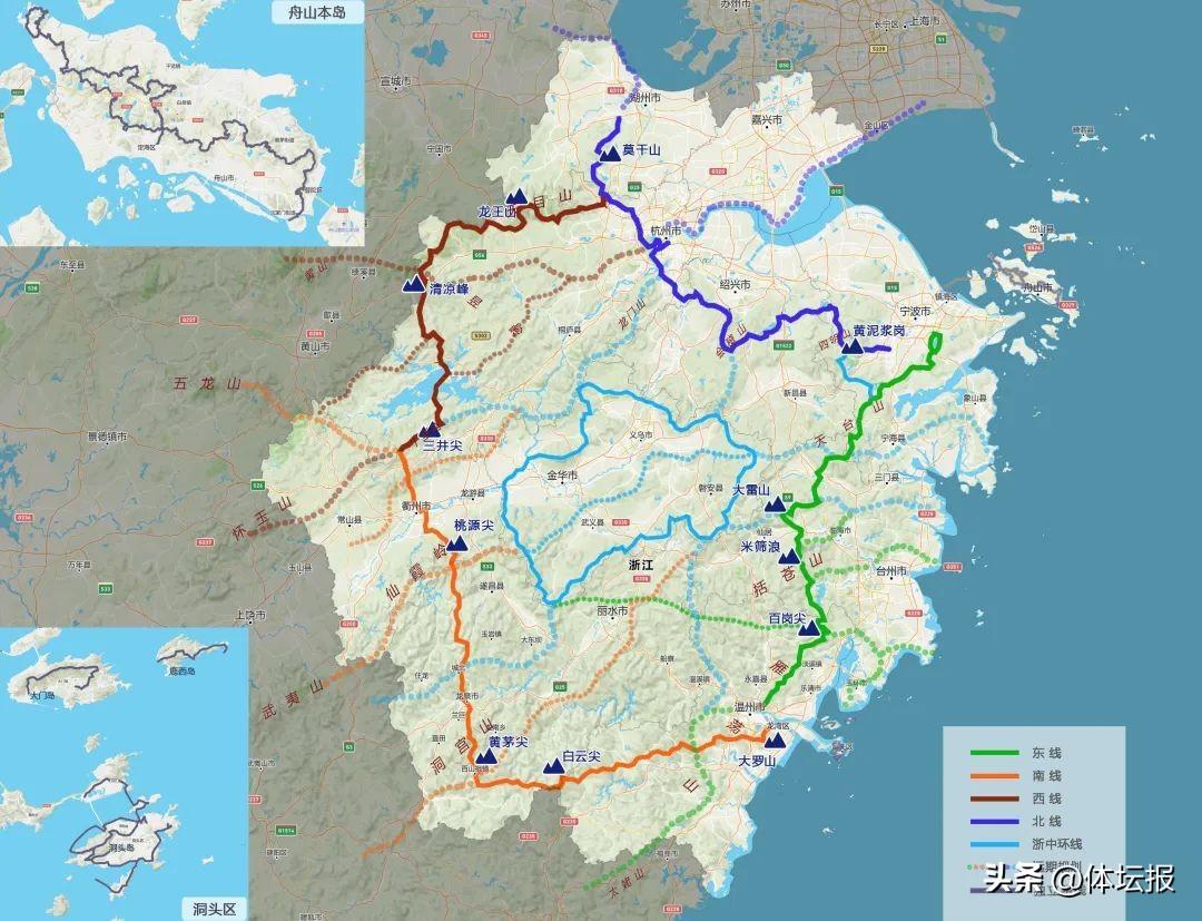 環浙步道西線由杭州清涼峯、湖州龍王山組成。起點位於杭州餘杭,餘杭良渚文化是中國文明的起源,西線“零號樁”亦是環浙步道的起點。東線包括台州米篩浪、寧波青虎灣崗,始於享有“西子風韻,太湖制氣魄”美譽的寧波東錢湖,與我省海岸線平行,是一條展現浙江山海相融的自然風光線路,線路貫穿了國家步道戶外運動“三縱四橫”的空間佈局。南線麗水黃茅尖、溫州白雲尖、衢州大龍崗是三個極具挑戰的戶外目的地。始於甌江入海口,串聯“兩江一花園”,整體呈東西轉南北走向,與安徽接壤。北線由紹興東白山、嘉興高陽山組成,途徑國家步道體系,從空間上勾連了三條詩路文化帶,分別是大運河文化帶、唐詩之路、錢塘江詩路,打通了杭州灣大灣區的主要山水資源。中線金華牛頭山和舟山對峙山則分別體現了綠水青山、東海長廊特色。