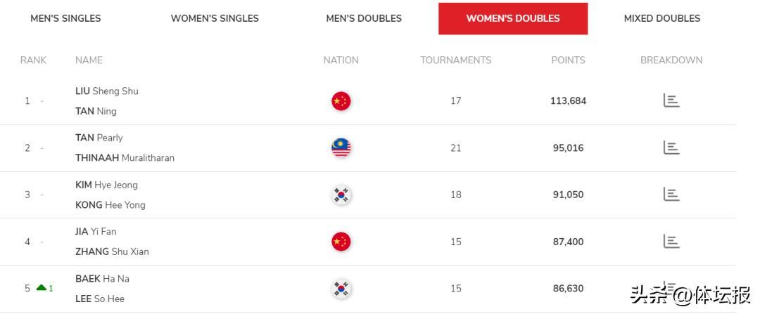 女雙除了“聖壇組合”,還有兩對國羽組合排名前十,分別是賈一凡/張殊賢(第四)和李怡婧/羅徐敏(第八)。