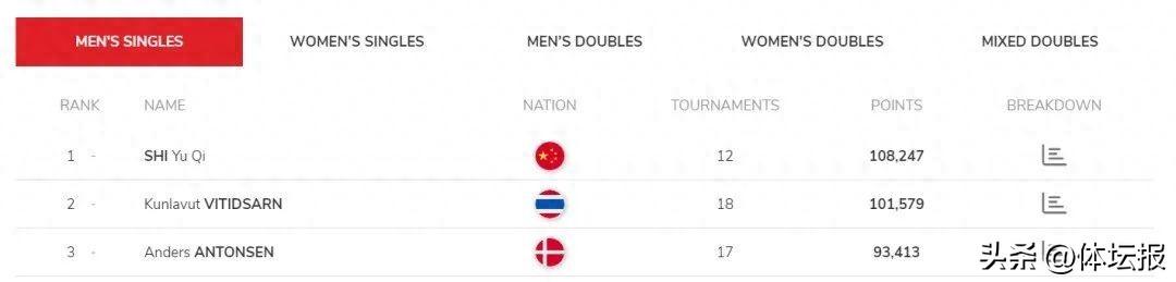 男單方面,泰國選手昆拉武特和丹麥選手安東森排在石宇奇之後位居第二、三位,李詩灃排名第六,是石宇奇之外僅有的入圍前十的國羽選手。