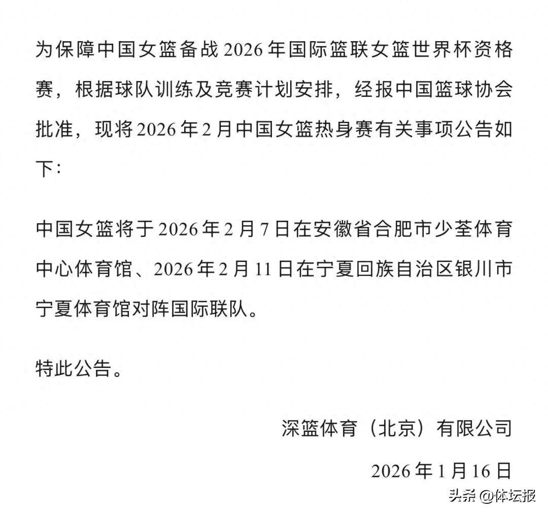 北京時間1月16日,據中國籃球之隊官方宣佈,中國女籃將於2月7日和2月11日分別在安徽合肥、寧夏銀川對陣國際聯隊。此次熱身賽的目的是保障中國女籃備戰2026年國際籃聯女籃世界盃資格賽。