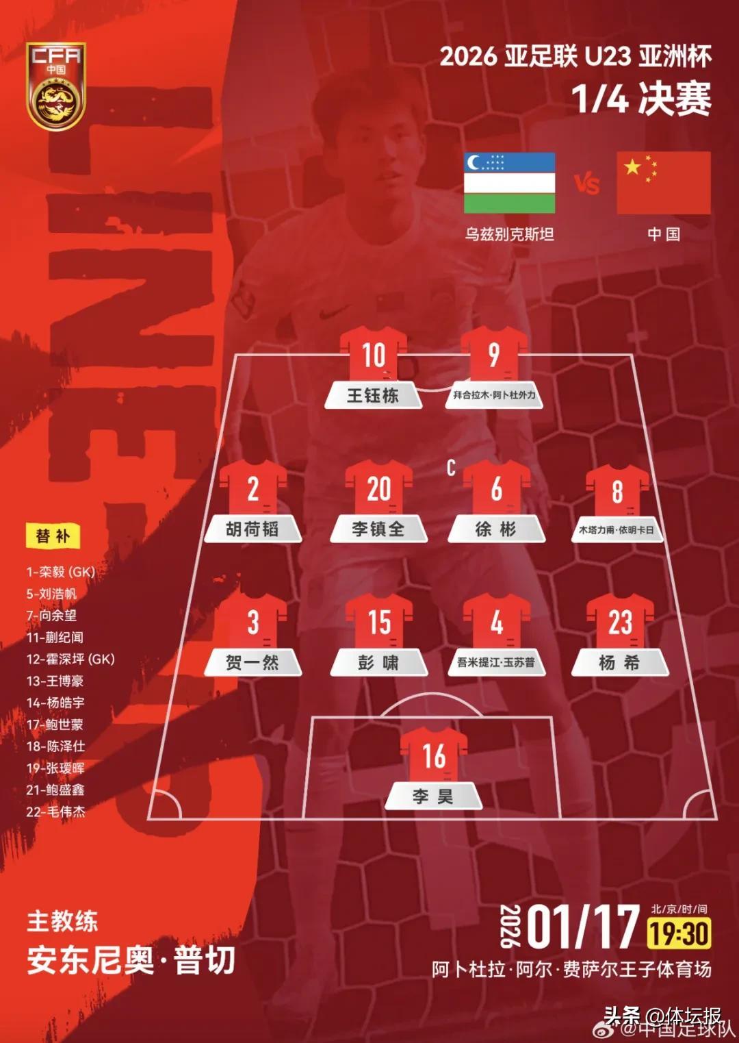 1月17日,U23亞洲盃的四強席位爭奪戰繼續,創歷史闖入淘汰賽的國足U23與烏茲別克斯坦U23展開爭奪。國足小夥子們在常規時間以及加時賽中逼平對手,最終在點球大戰中以4:2取勝,首次晉級四強。中國隊闖入八強就已經創造了在該項賽事中的隊史最好成績,如今則再創歷史。