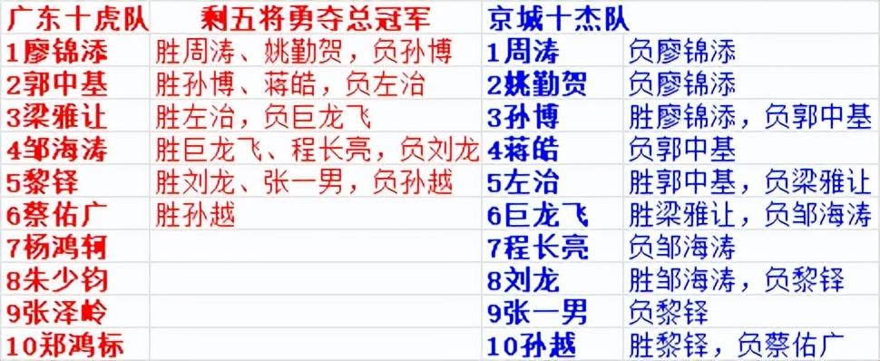 廣東十虎隊十將戰單,同依序,廖錦添勝周濤、姚勤賀,負周博,郭中基勝孫博、蔣皓,負左治,梁雅讓勝左治、負巨龍飛,鄒海濤勝巨龍飛、程長亮,負劉龍,黎鐸勝劉龍、張一男,負孫越,蔡佑廣勝孫越,楊鴻軻、朱少鈞、張澤嶺、鄭鴻標四將未上陣。