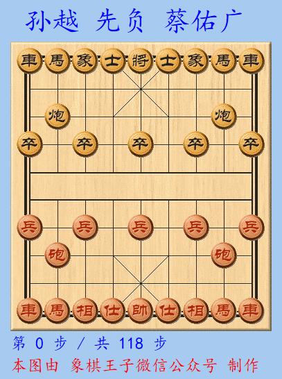 蔡佑廣執黑棋電光石火中,強取紅棋一馬,紅丟子後,黑馬炮進攻,至118手,馬炮單缺士對炮兵雙相,紅超時,蔡佑廣勝出。