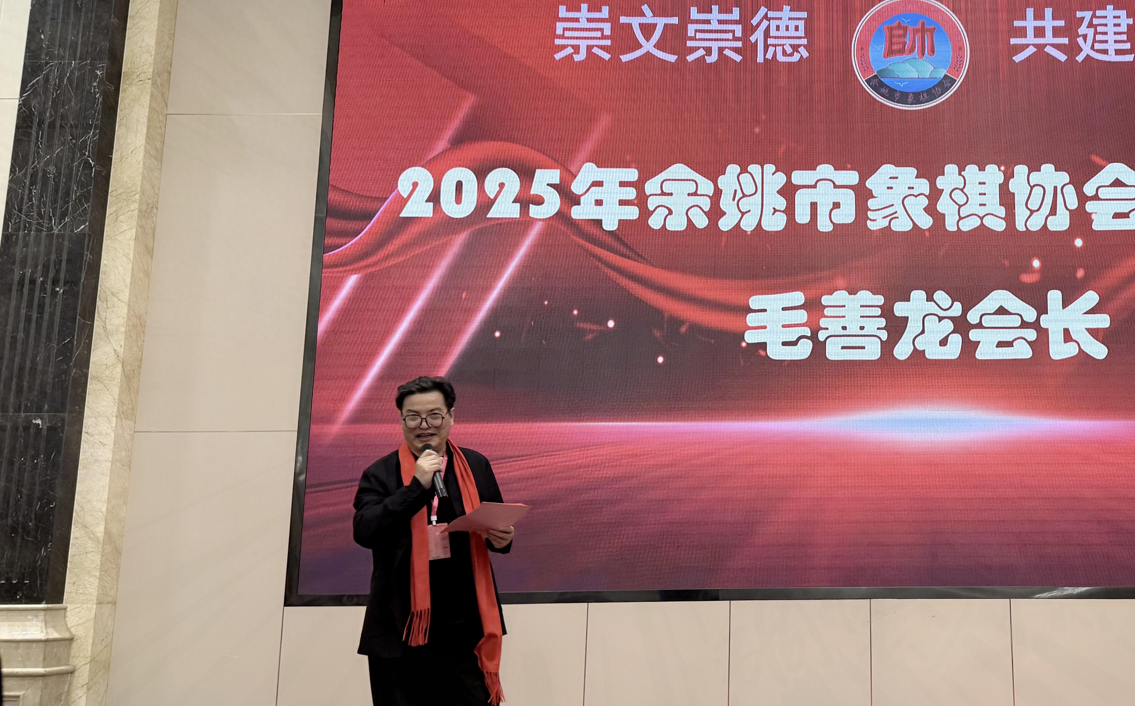 在餘姚市象棋協會年會暨2025年度工作報告上,餘姚市象棋協會主席毛善龍發表重要講話。