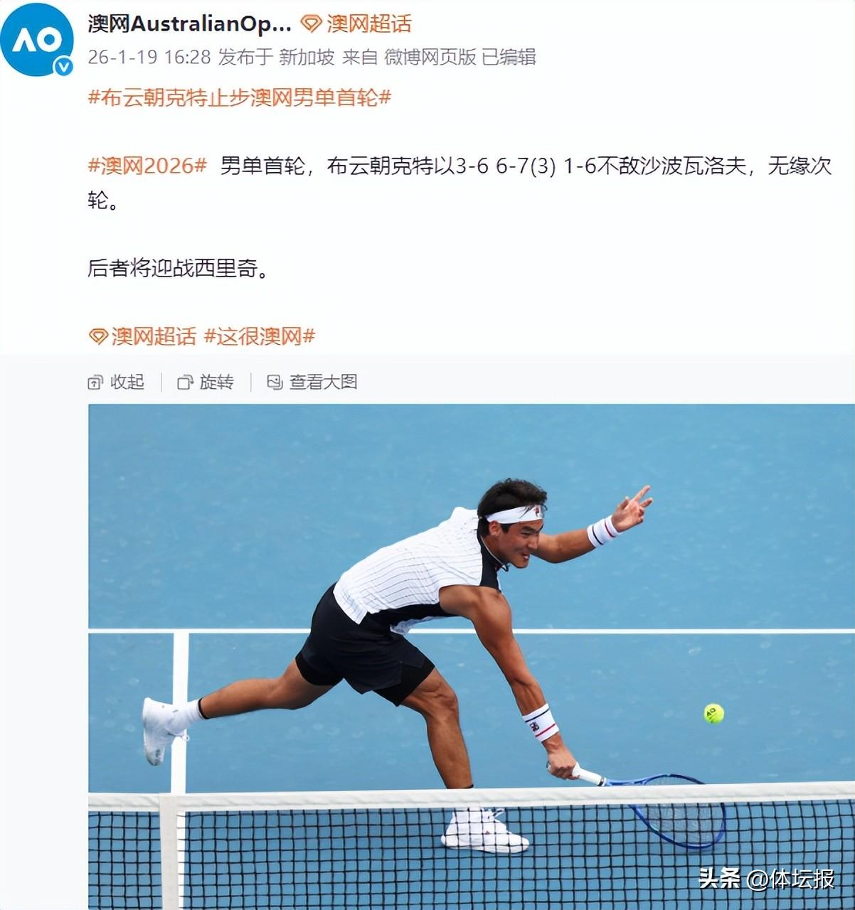 1月19日,在澳網正賽第二比賽日男單首輪比賽中,浙江選手布雲朝克特大戰2小時15分鐘,三盤不敵21號種子、加拿大選手沙波瓦洛夫,遭遇首輪遊。