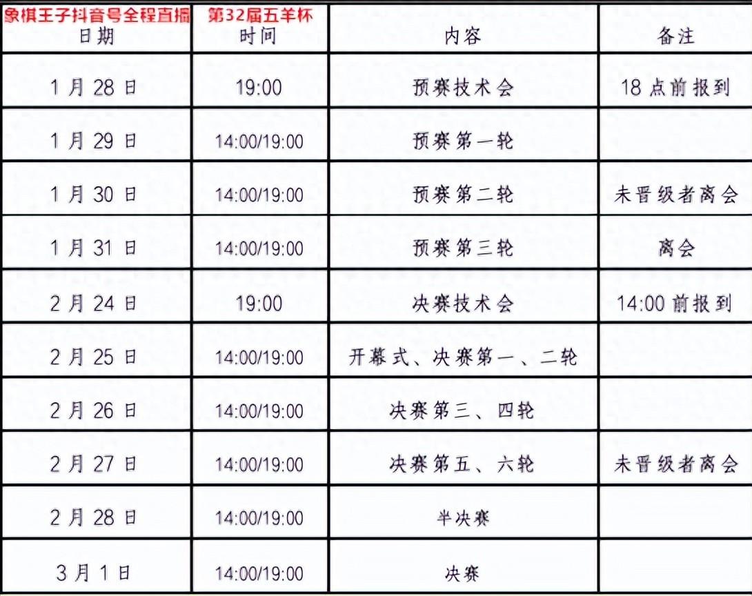 看棋壇超級大戰,弈林金字招牌,傳承四十五載的五羊杯首次以公開組+元老組雙軌制並行進行,首度引入海外棋手和女子棋手及港澳臺組,115將的巔峯決戰,豪力爭鋒,超百萬大獎A級賽,110萬的至強火拼,1月29日至31日預賽全淘汰慘烈搏殺,2月25日至3月1日決賽階段大決戰,誰能一舉出線,直撲決鬥,登頂王中王,豪攬金座,象棋王子也將進行全程的直播與報道(抖音:象棋王子),與棋友一起共見精彩大斗,爲大賽和五羊杯擊鼓,助力,喝彩!