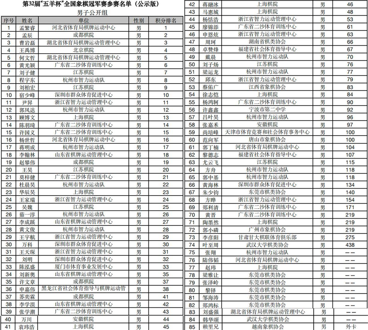 根據規定,公開組1960年之後棋手,男子按積分前96預選,女子前十六預選,港澳臺按3、2、3的人數配比預選,元老組需五十歲以上全國男子冠軍。