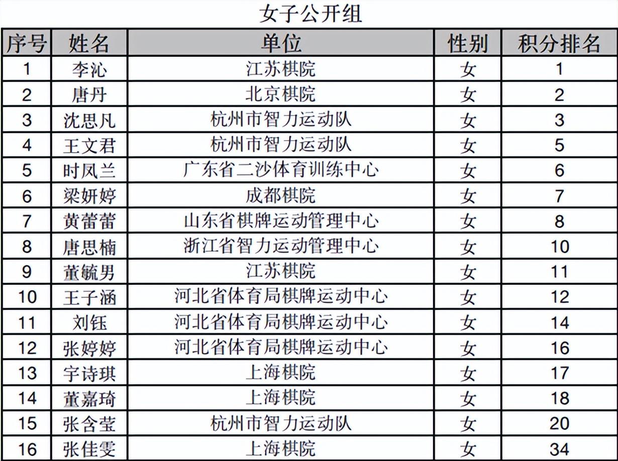 按照抽籤規則,唐丹第二小組,李沁第一小組,其他十四將,按照每兩人一梯隊,輪流抽籤,進入相應組,組內編號1至8。