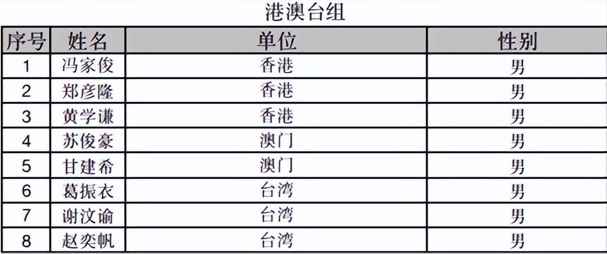 港澳臺組,爲第十五小組,中國香港隊馮家俊、鄭彥隆、黃學謙,中國澳門隊蘇俊豪、甘建希,中國臺北隊葛振衣、謝汶諭、趙奕帆,八人蔘加,戰法同上,第一齣線。