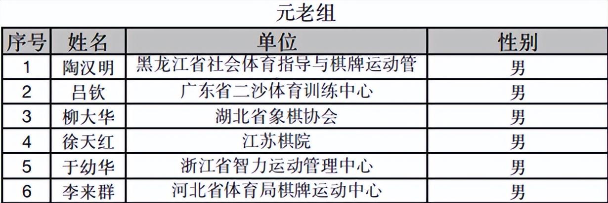 元老組,六位50歲以上的冠軍,分別是棋壇宗師、廣東象棋靈魂人物、世界五冠王呂欽,棋界宗師級人物、全國四冠王、燕趙驕子李來羣,以及長白虎陶漢明,東方電腦柳大華,笑面佛徐天紅,拼命三郎於幼華。