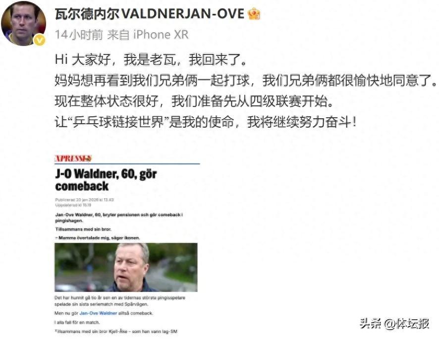 1月21日,瑞典乒乓球名將、現年60歲的“老瓦”瓦爾德內爾宣佈復出,他在社交媒體上發文: