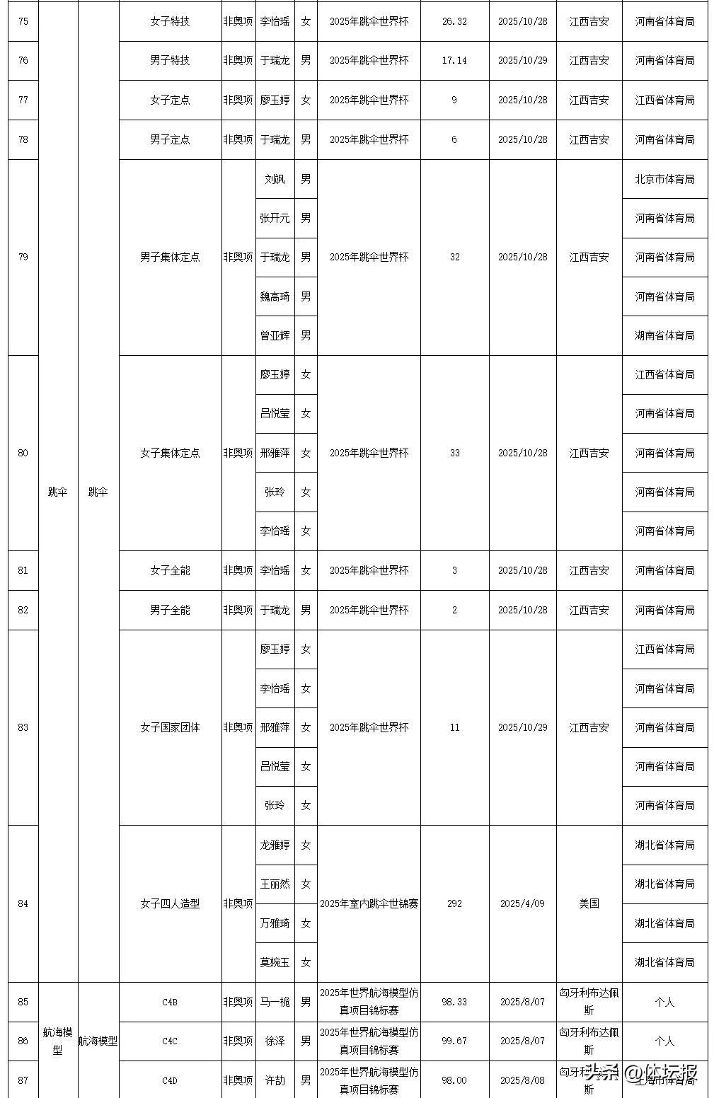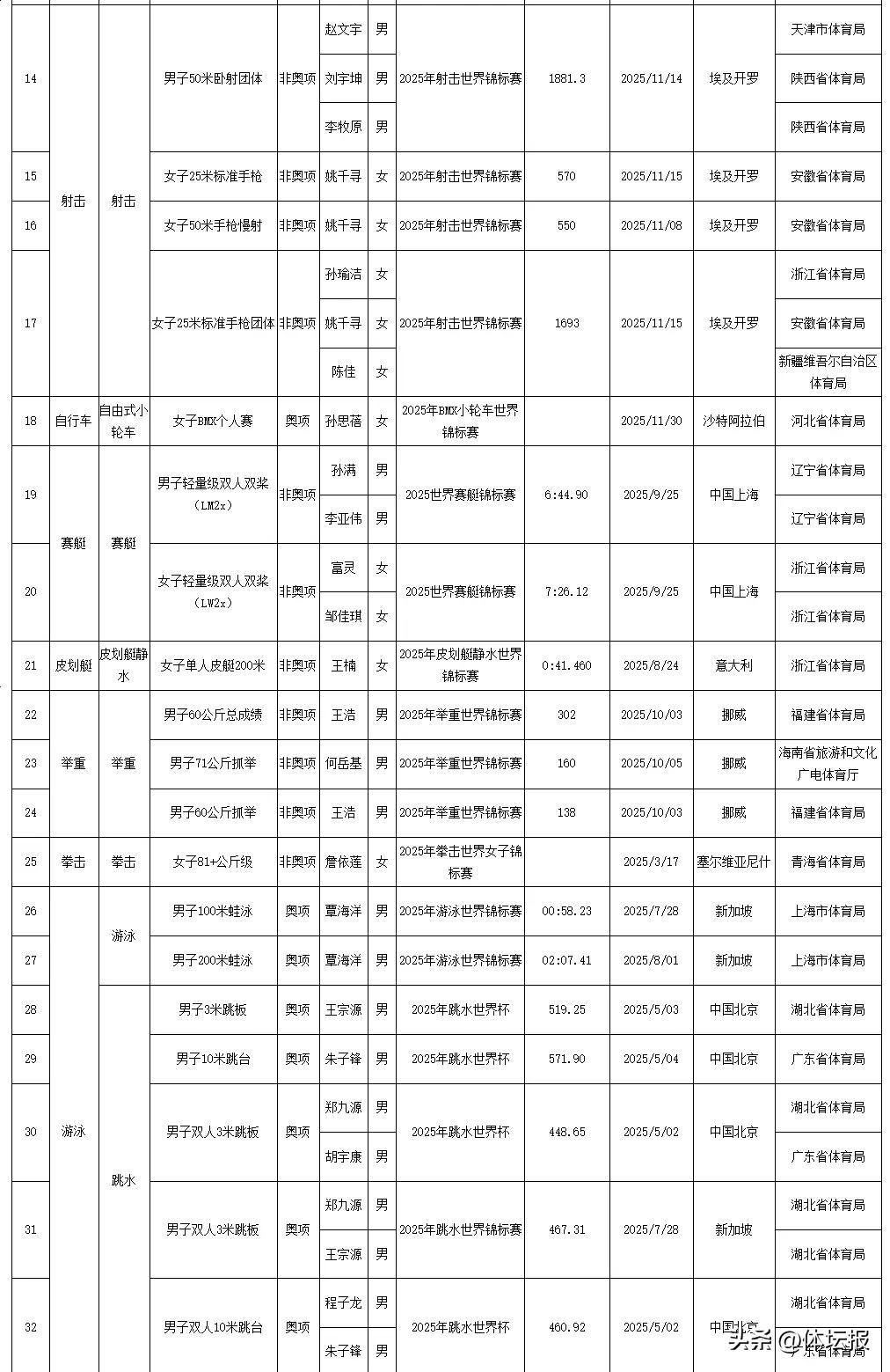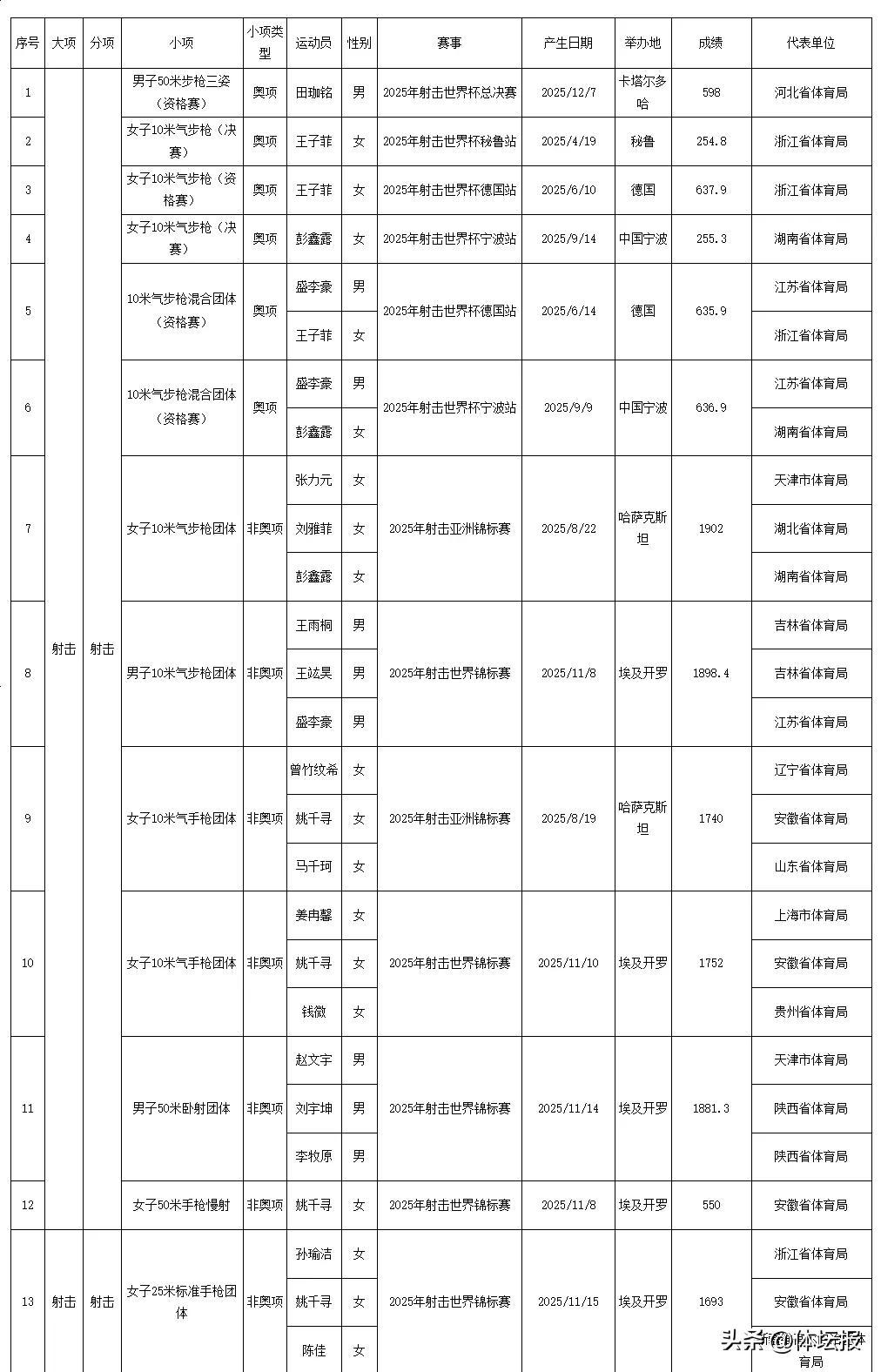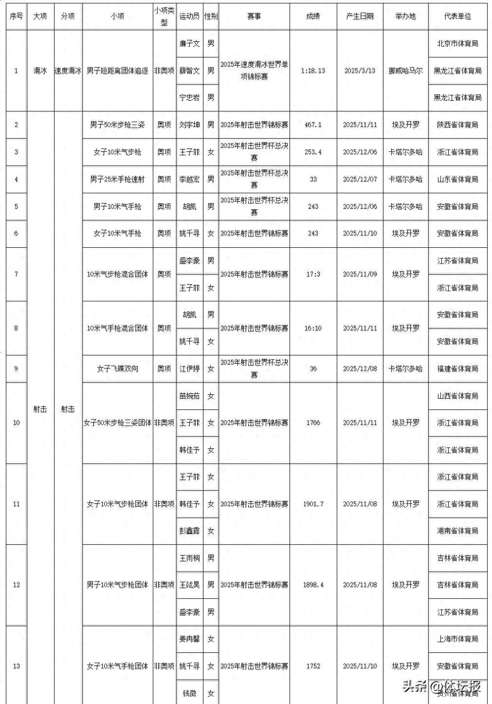 今天國家體育總局官網發佈了2025年我國運動員獲世界冠軍、創世界紀錄統計浙江共有18人次獲得世界冠軍其中,浙江射擊運動員王子菲、孫瑜潔分別打破3項和1項世界紀錄一起來看↓↓↓2025年我國運動員獲世界冠軍統計2025年我國運動員創世界紀錄統計爲中國體育健兒點贊!來源:國家體育總局競技體育司