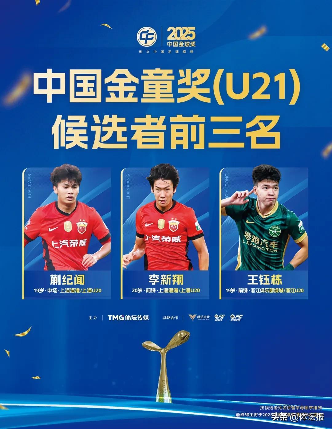 據介紹,經評委投票,蒯紀聞、李新翔和王鈺棟在金童獎U21組別排名前三。其中,蒯紀聞和王鈺棟剛剛隨U23國家隊一起殺入亞洲盃決賽,而他們的隊友徐彬、吾米提江和楊希也入圍了2025中國金童獎(U21)的候選序列,分列第4、第6和第8位。