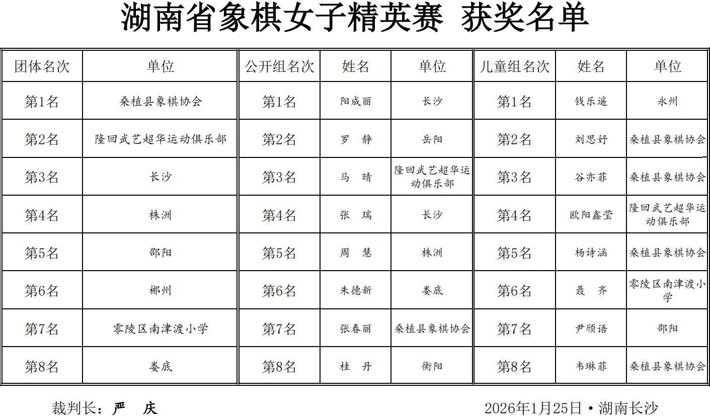 熱烈祝賀2026年湖南省象棋女子精英賽暨湖南省棋類協會象棋工作委員會2026年工作會議在長沙圓滿成功,賀喜陽成麗、錢樂遙、桑植隊分獲公開組、兒童組、團體組冠軍,恭喜隆回武藝超華俱樂部、長沙、羅靜、馬晴等優秀獲獎隊伍和棋手,恭祝周文彬等當選省象協各部,部長、副部長,祝福湖南象棋和長沙象棋及湘軍女子棋業紅紅火火,芝麻開花節節高,更上一層樓!
