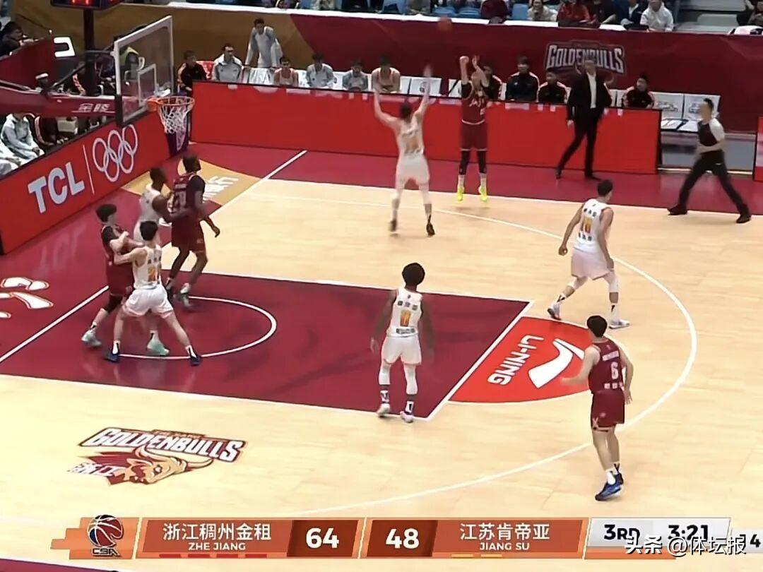 易邊再戰,陸文博空位遠投,爲浙江男籃率先拿到三分。相較於上半場,兩隊總體進攻效率變低。江蘇男籃,近四分鐘僅罰球得到一分,賈爾斯投籃命中爲球隊打破進球荒。斯塔克斯出現失誤,浙江男籃利用機會反擊,瓊斯三分進球。程帥澎復出後狀態逐漸變好,打出自己特色,三分穩穩命中。還剩六秒,雙方換人,浙江男籃最後一攻沒能打進,但67:52仍保持着較大分差。
