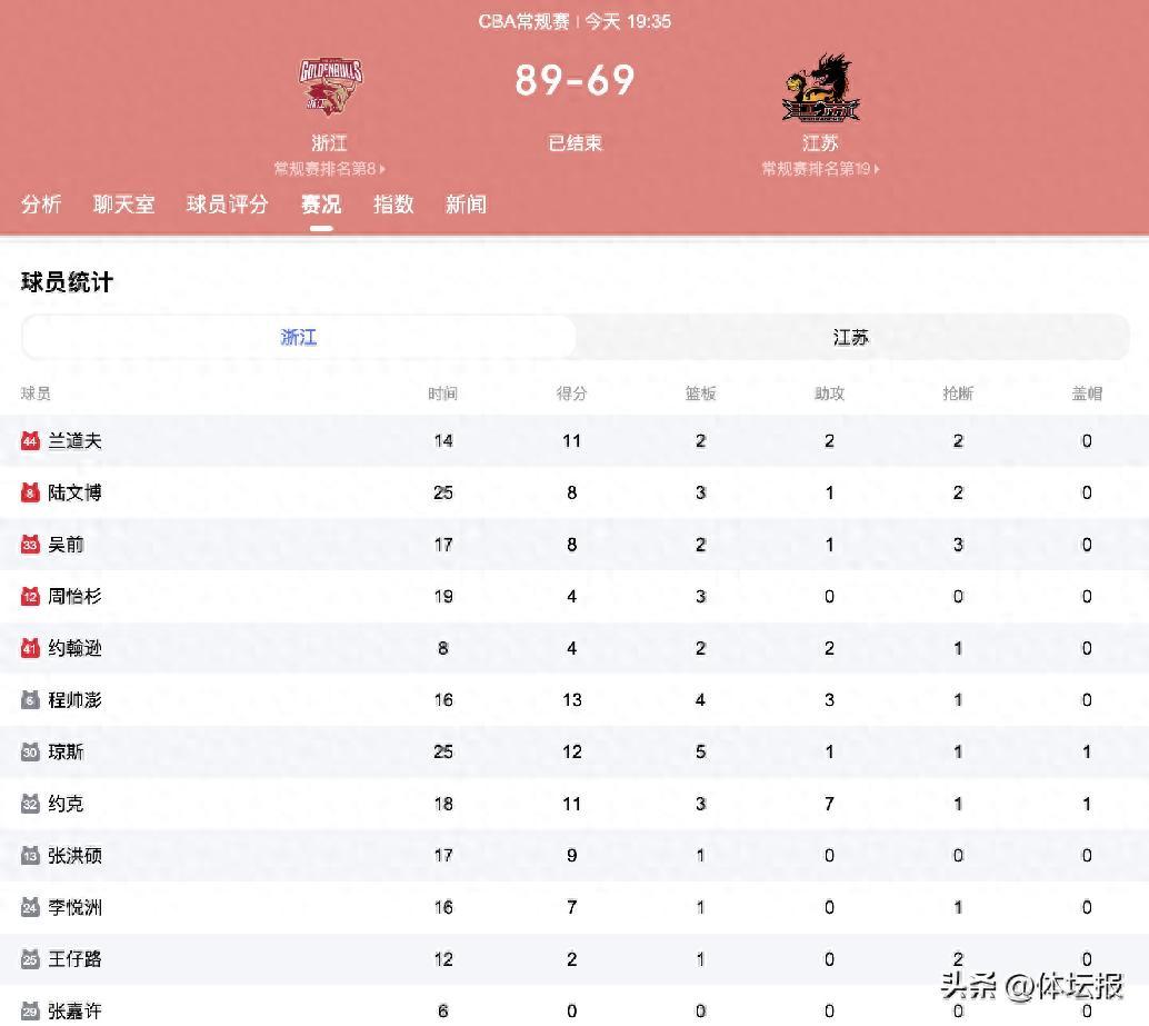 首發陣容,浙江男籃派上陸文博、周怡杉、吳前、約翰遜、蘭道夫。江蘇男籃則是斯塔克斯、馬國棟、龐崢麟、吳羽佳、亨特出戰。