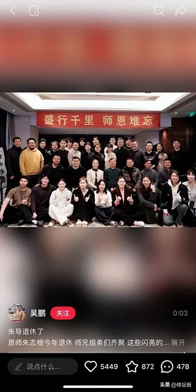 1月27日,中國游泳名將吳鵬在個人社交平臺曬出了恩師、浙江游泳隊功勳教練朱志根退休聚會的視頻。
