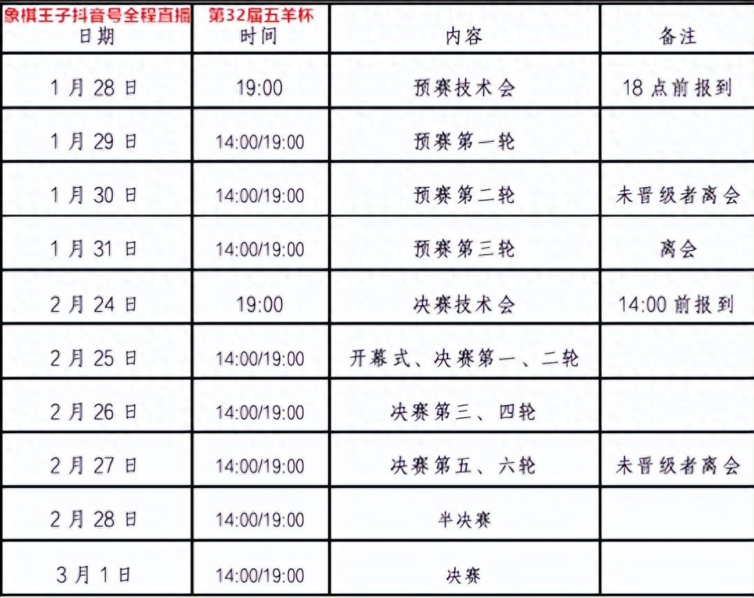 看棋壇超級大戰,傳承四十五年的巔峯盛會,第32屆五羊杯火熱而起,總獎巨達110萬,在百萬之上,冠軍三十萬,天下羣豪全速拼奪,男女強將全力搏鬥,1月29日至31日,臘月十一至臘月十三,每天下午兩點、晚上七點,108將的預賽淘汰戰浴血廝殺,誰能一舉衝出,豪進前路,拿到百萬鉅獎衝鋒席位,直挺決賽階段和奔襲王冠,象棋王子也將進行全程的直播和報道(抖音:象棋王子),與棋友一起共見精彩大戰,敬請關注、支持、守護,謝謝!