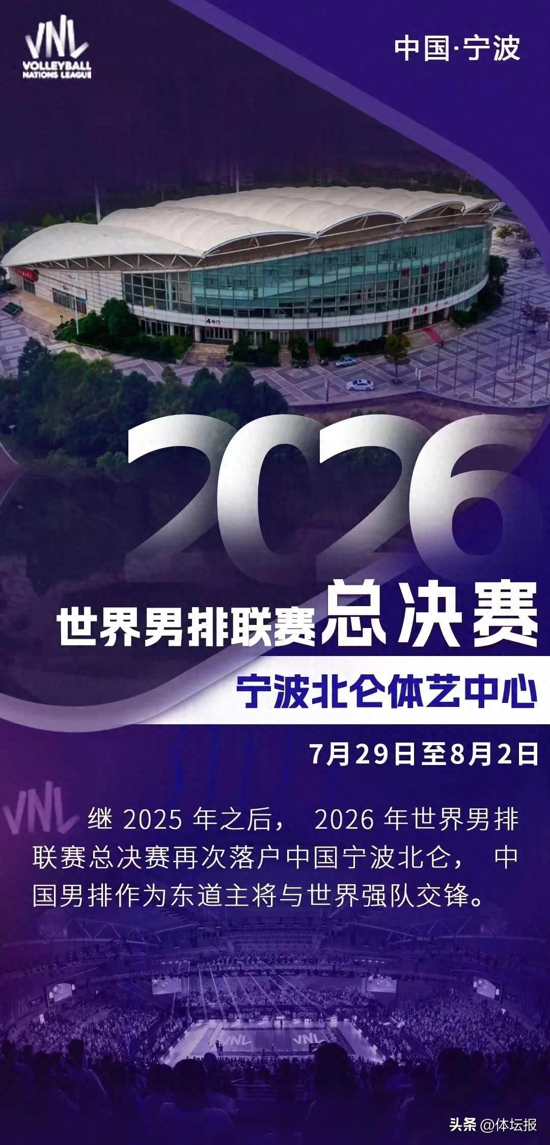 其中,2026年世界男排聯賽總決賽由中國承辦,舉辦地點確定爲寧波北侖。比賽將於7月29日至8月2日在北侖體藝中心舉行。