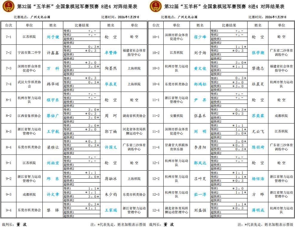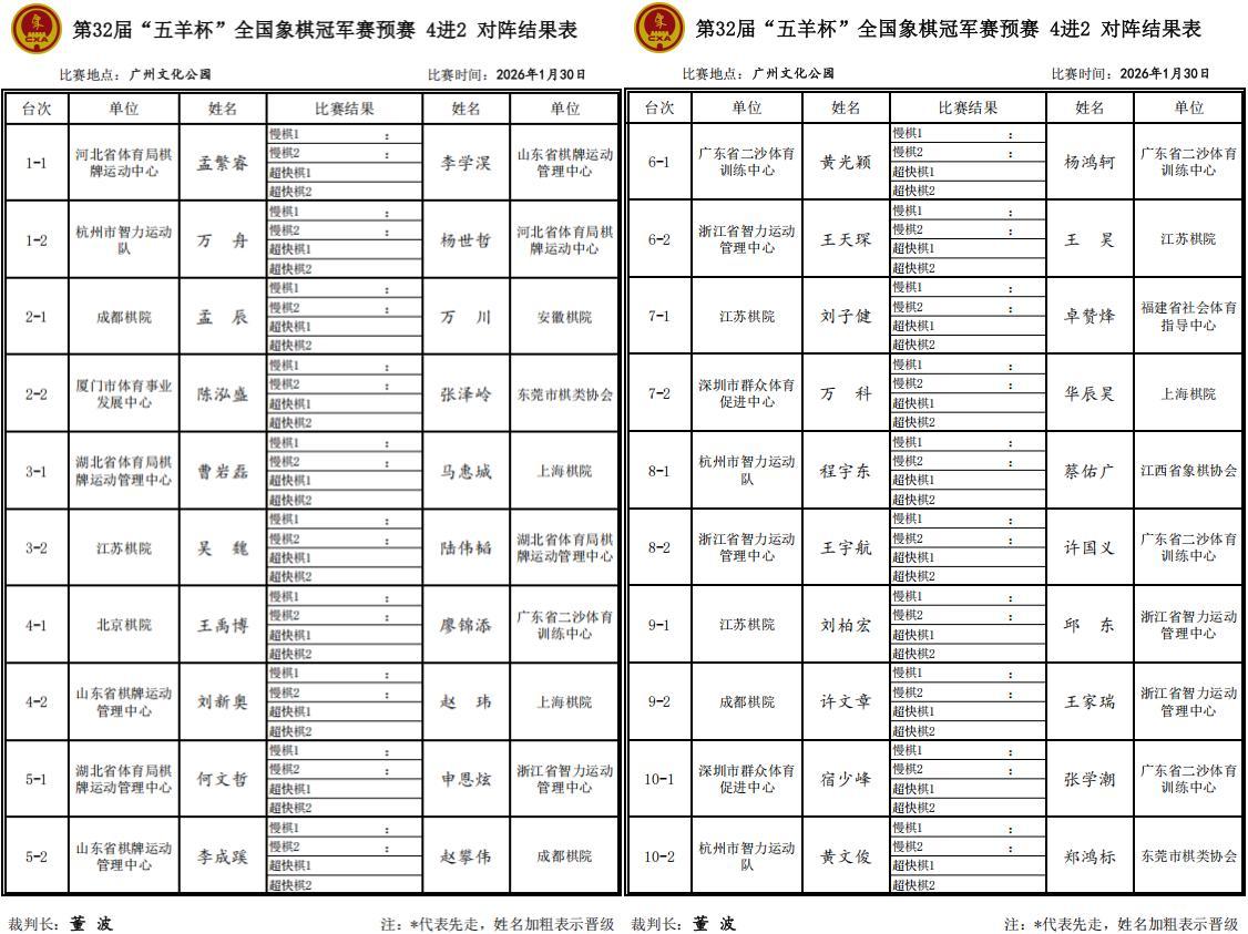 大賽30日下午兩點、晚上七點,進行本次五羊杯預賽各組四強分先兩局淘汰賽的超級大斗,誰能勝出,強力打進各組決戰,衝擊出線大權,奔向決賽階段強勢大席位,象棋王子也將繼續進行全程的直播和報道(抖音:象棋王子),敬請關注、支持、守護,謝謝!