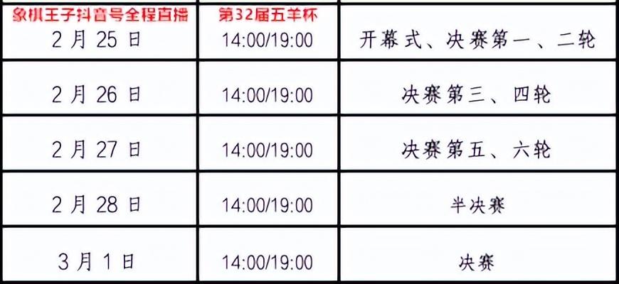比賽正賽2月25日至3月1日,正月初九至正月十三,每天下午兩點、晚上七點,屆時象棋王子抖音號也會持續全程直播。