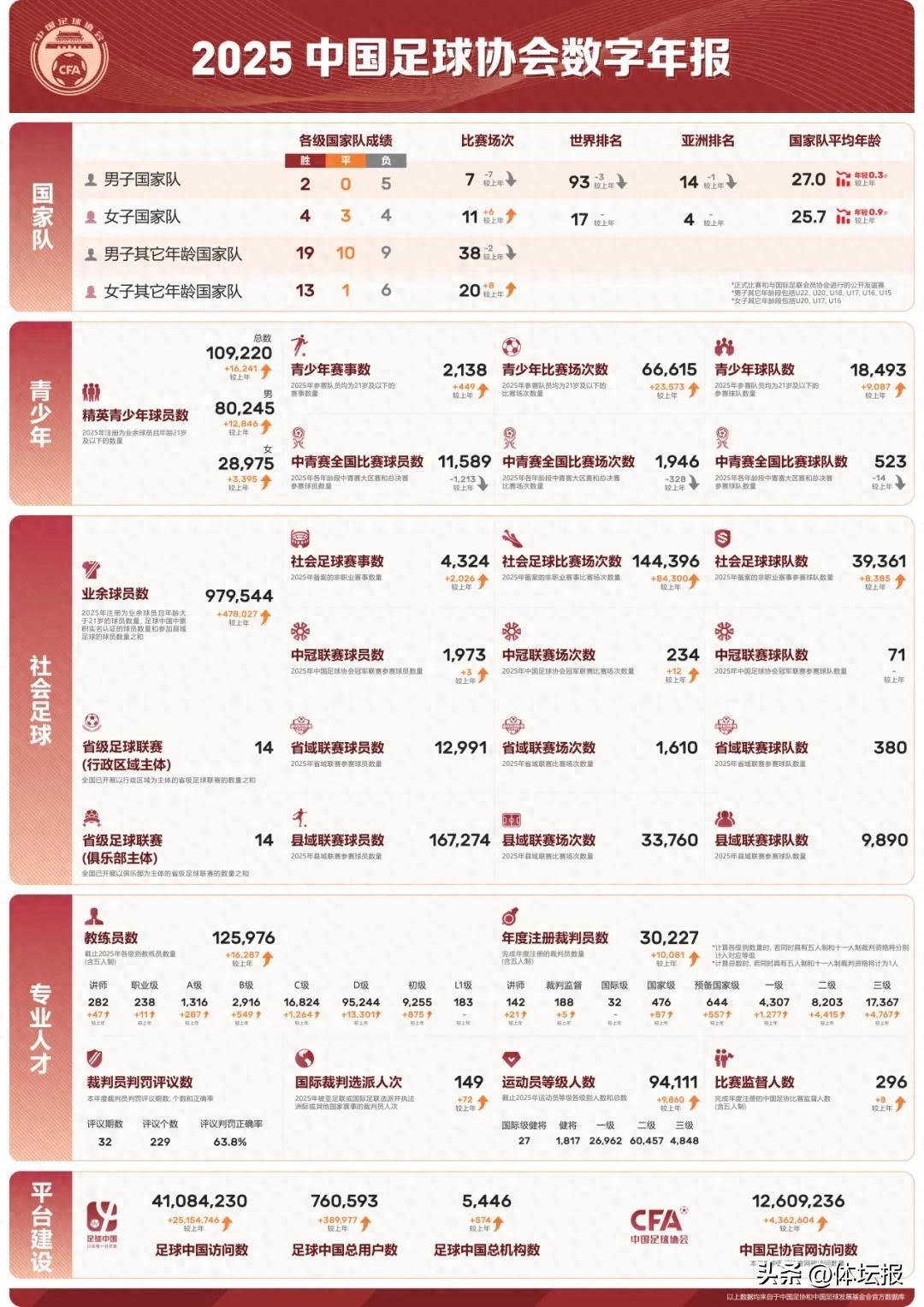 1月30日,2025年中國足球協會數字年報發佈,年報聚焦國家隊建設、青少年培養、社會足球發展、專業人才隊伍建設及數字化平臺搭建五大重點業務板塊,設置37項關鍵指標、79個數據點。通過與2024年度數據的對比分析,全面、量化呈現了中國足協年度重點工作的推進情況與發展趨勢。