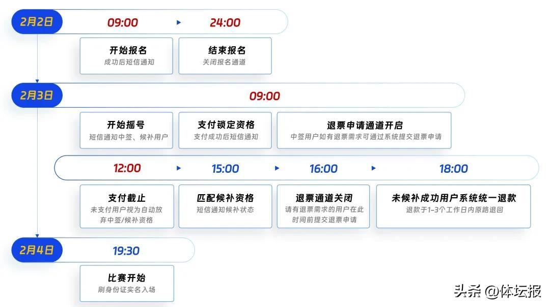 2月3日9:00系統將隨機抽籤,同時搖出中籤用戶和候補用戶,請中籤/候補球迷朋友在12:00前及時完成支付來鎖定資格,未及時支付的將視爲自動放棄中籤/候補資格。