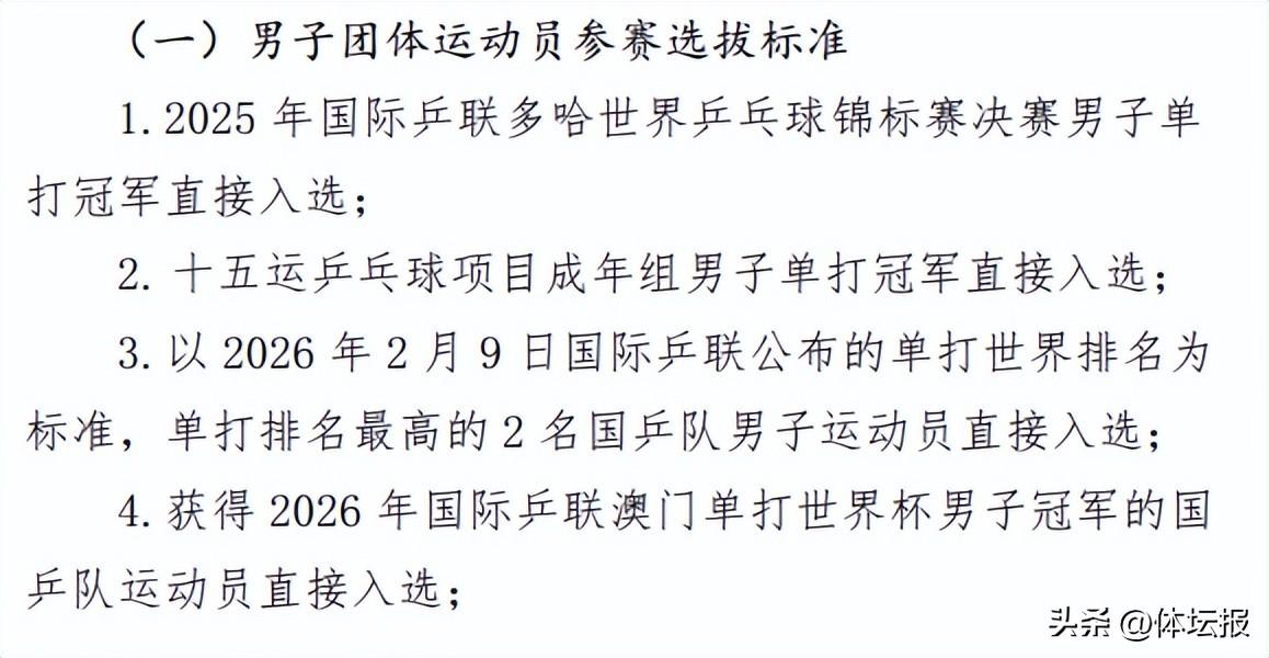 4.獲得2026年國際乒聯澳門單打世界盃男子冠軍的國乒隊運動員直接入選;(待定)