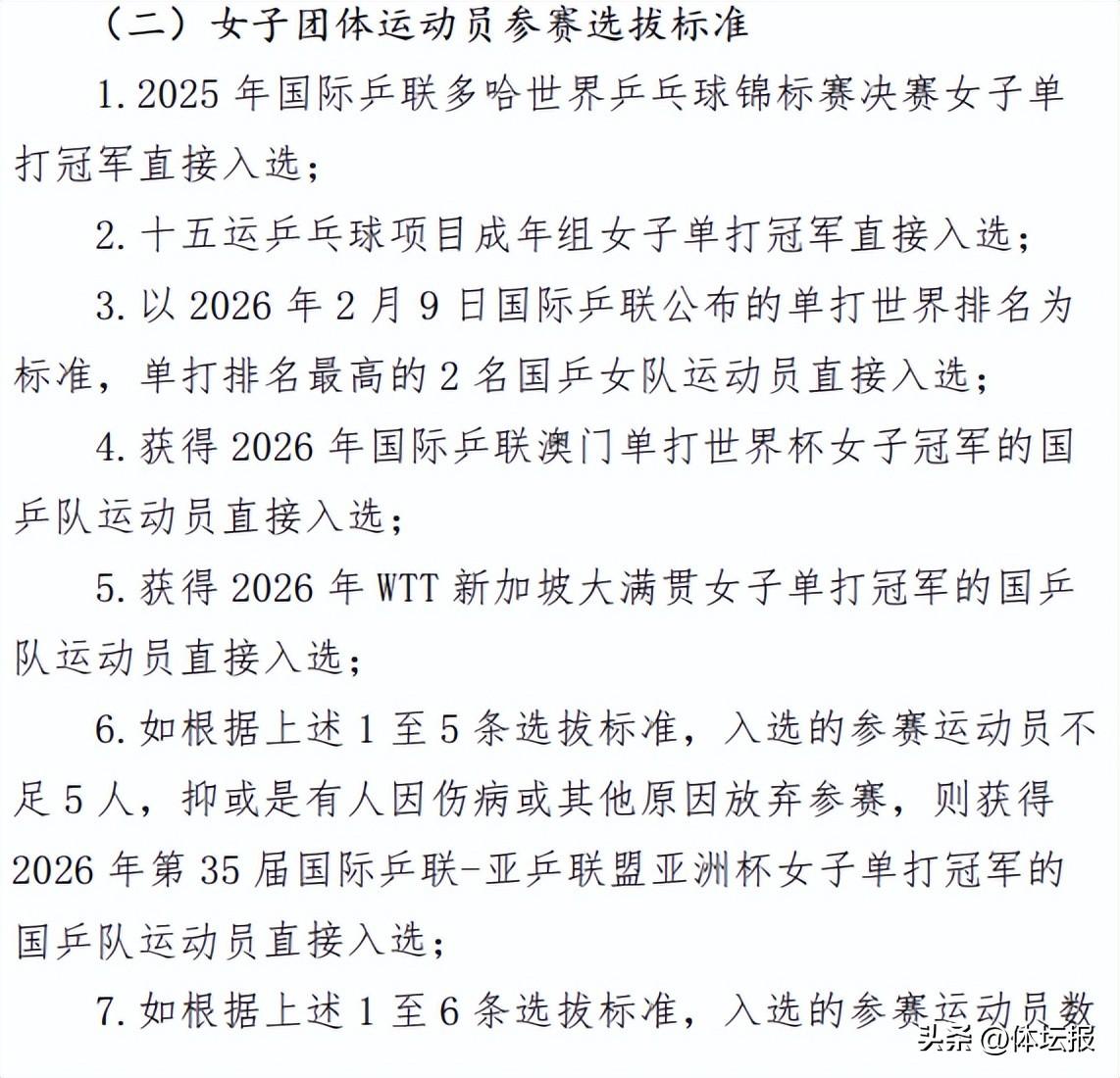 4.獲得2026年國際乒聯澳門單打世界盃女子冠軍的國乒隊運動員直接入選;(待定)
