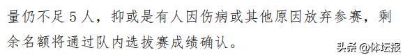 6.如根據上述1至5條選拔標準,入選的參賽運動員不足5人,抑或是有人因傷病或其他原因放棄參賽,剩餘名額將通過隊內選拔賽和教練組綜合評估產生。