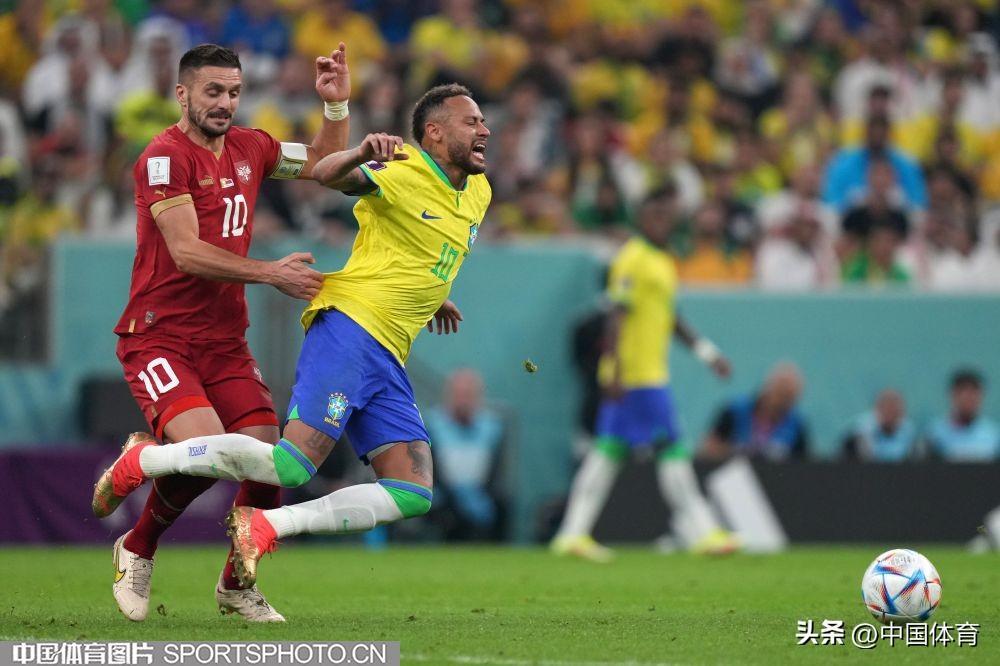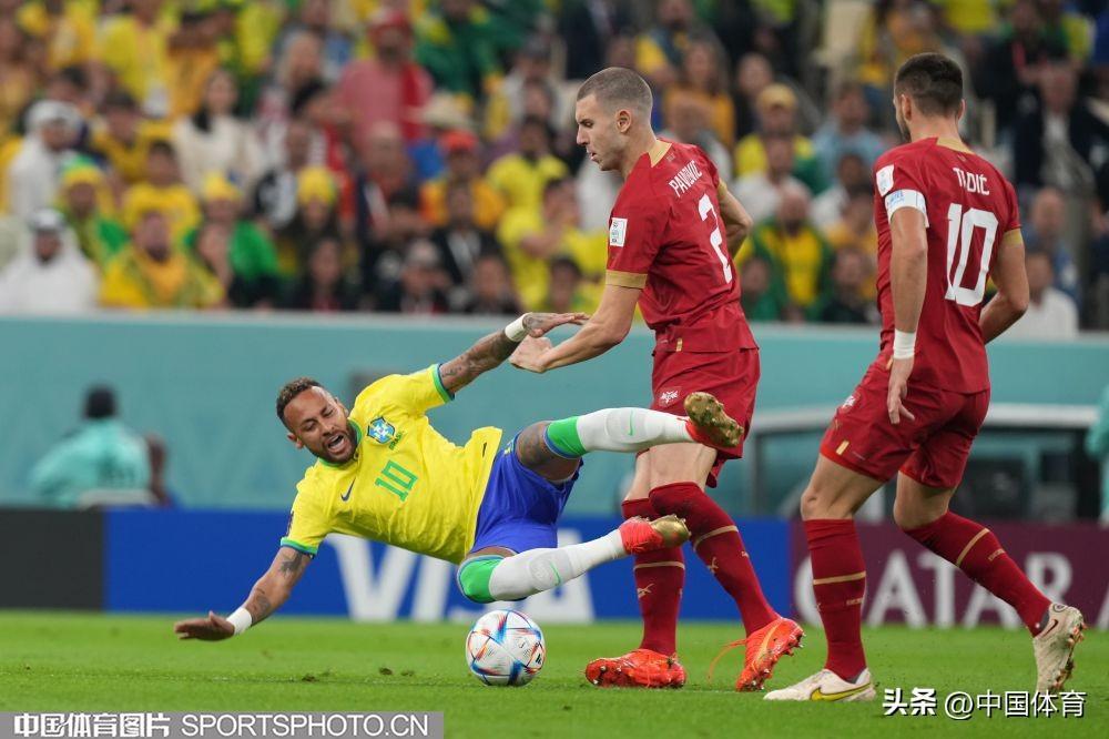 圖爲巴西隊內馬爾被塞爾維亞隊塔迪奇侵犯倒地