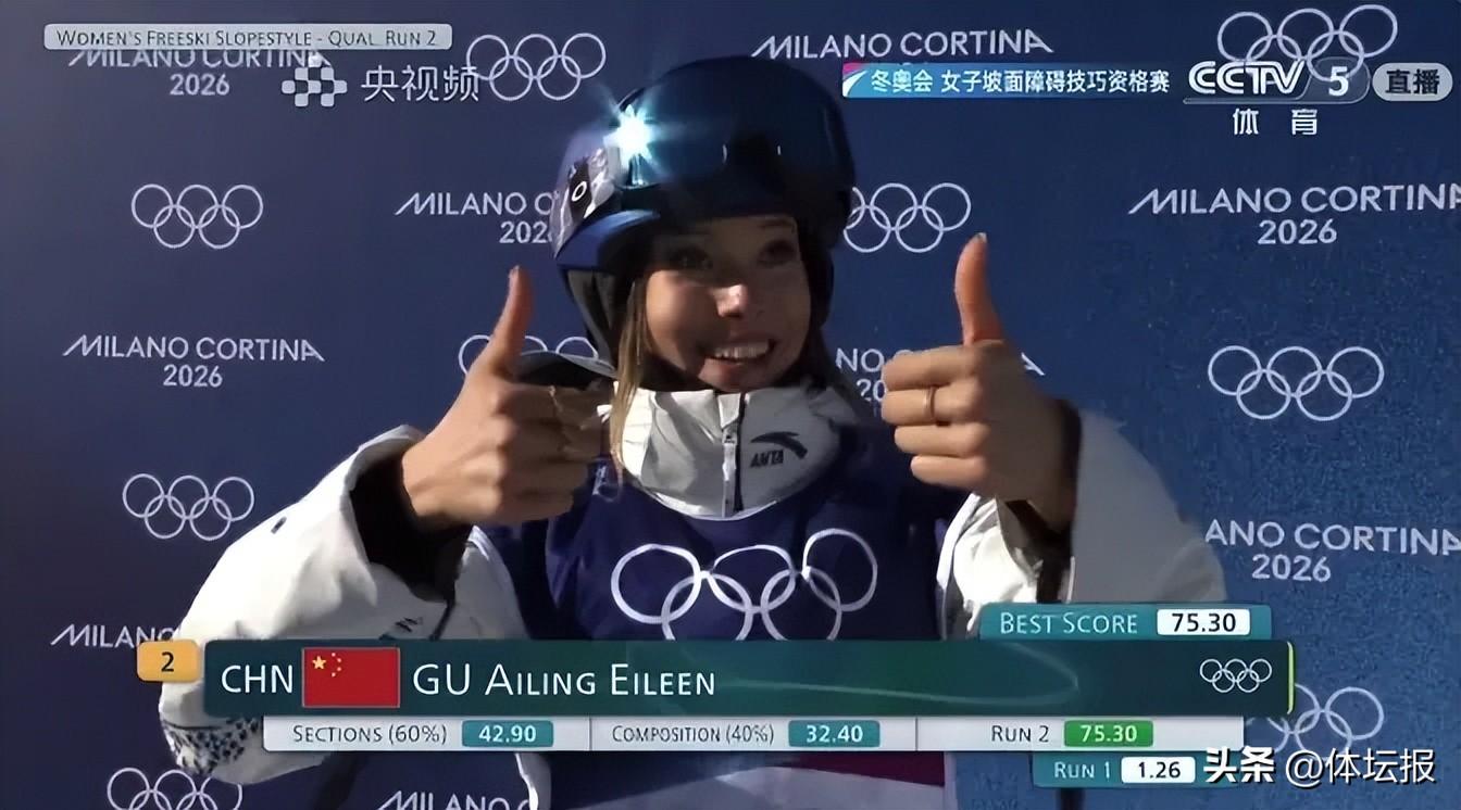 第二輪滑行中,谷愛凌頂住壓力,流暢地通過道具區後,在大跳臺區盡展舒展的動作,最終得到75.30分,位列預賽第二。