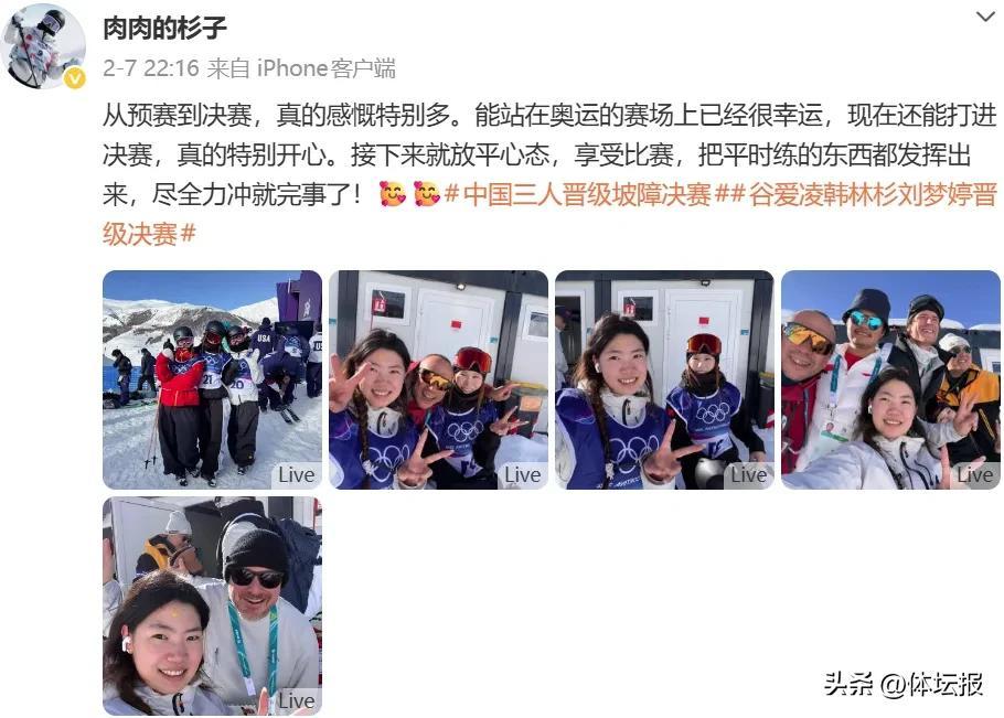 賽後,谷愛凌在社交媒體上發自拍幽默配文:“抱歉嚇到大家了。就是想讓大家都保持緊張感”。韓林杉發文:從預賽到決賽,真的感慨特別多。能站在奧運的賽場上已經很幸運,現在還能打進決賽,真的特別開心。接下來就放平心態,享受比賽,把平時練的東西都發揮出來,盡全力衝就完事了!
