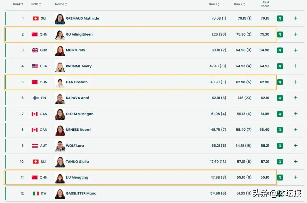 回顧預賽首輪,第二個登場的谷愛凌在開場滑行通過第一個道具時出現失誤,首輪僅得到1.26分。楊如意也出現失誤,首輪滑行得到10.38分。劉夢婷發揮穩定,儘管略有瑕疵,但是完整地完成了比賽,得到47.98分,暫居第八名。緊跟劉夢婷出場的韓林衫以43.93分的成績暫居第11名。
