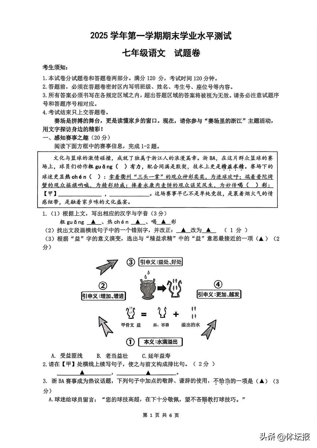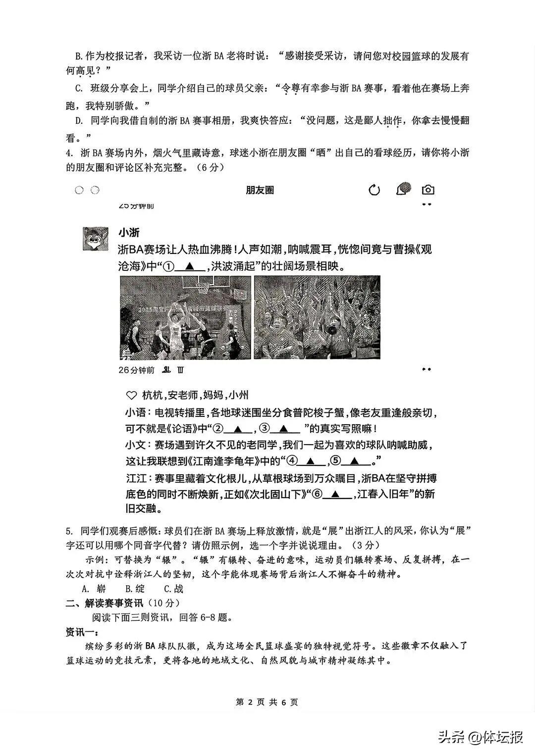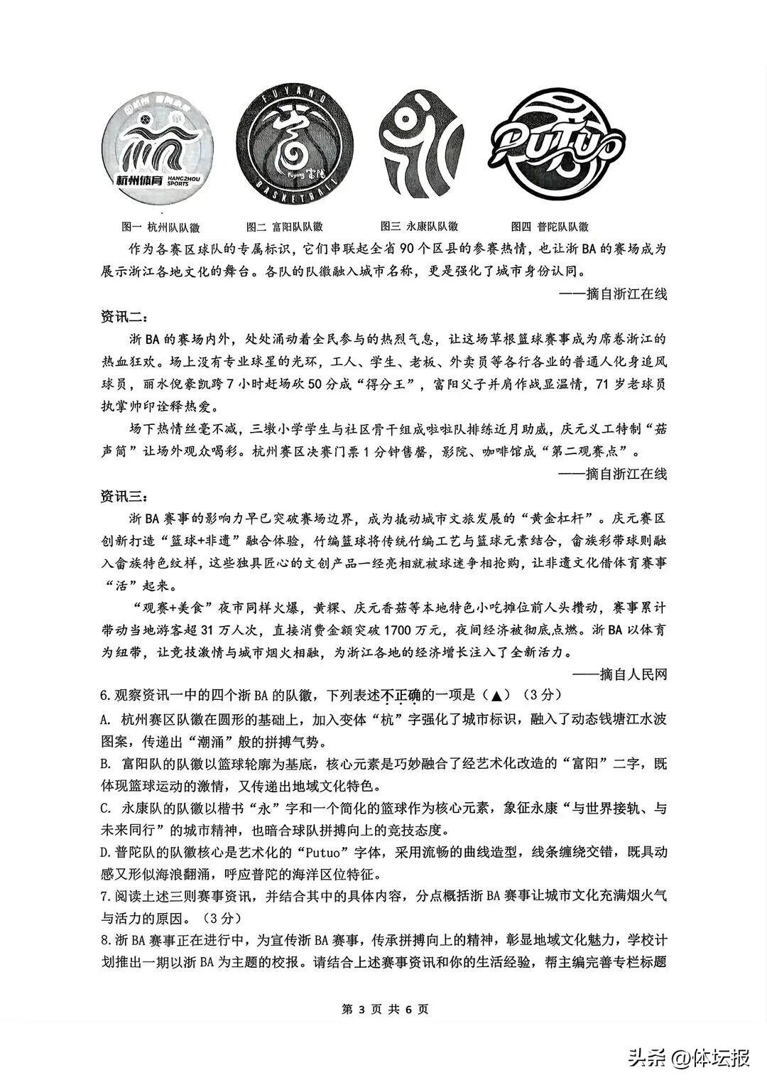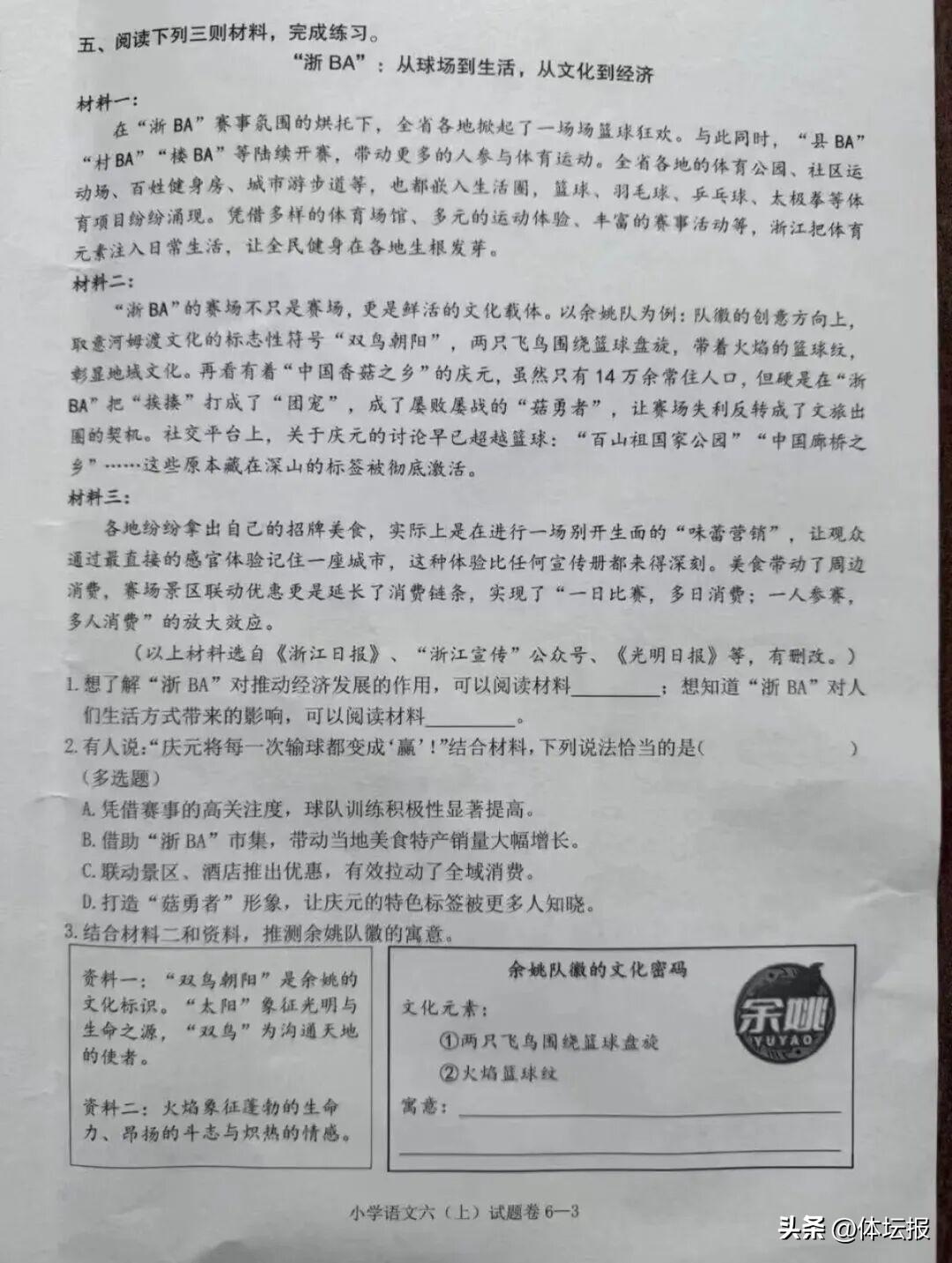 杭州餘杭區七年級語文試卷也圍繞浙BA設計試題,涉及隊徽、倪豪凱、體育推動文旅發展等熱點。參與命題的老師表示,之所以選擇浙BA這一主題,正是因爲它“既貼近生活,又正能量滿滿”。餘姚的六年級語文試卷聚集浙BA與文化、經濟融合的主題,將餘姚隊徽中象徵河姆渡文化的標誌性符號“雙鳥朝陽”與慶元隊“屢敗屢戰”的“菇勇者”精神搬上試卷。