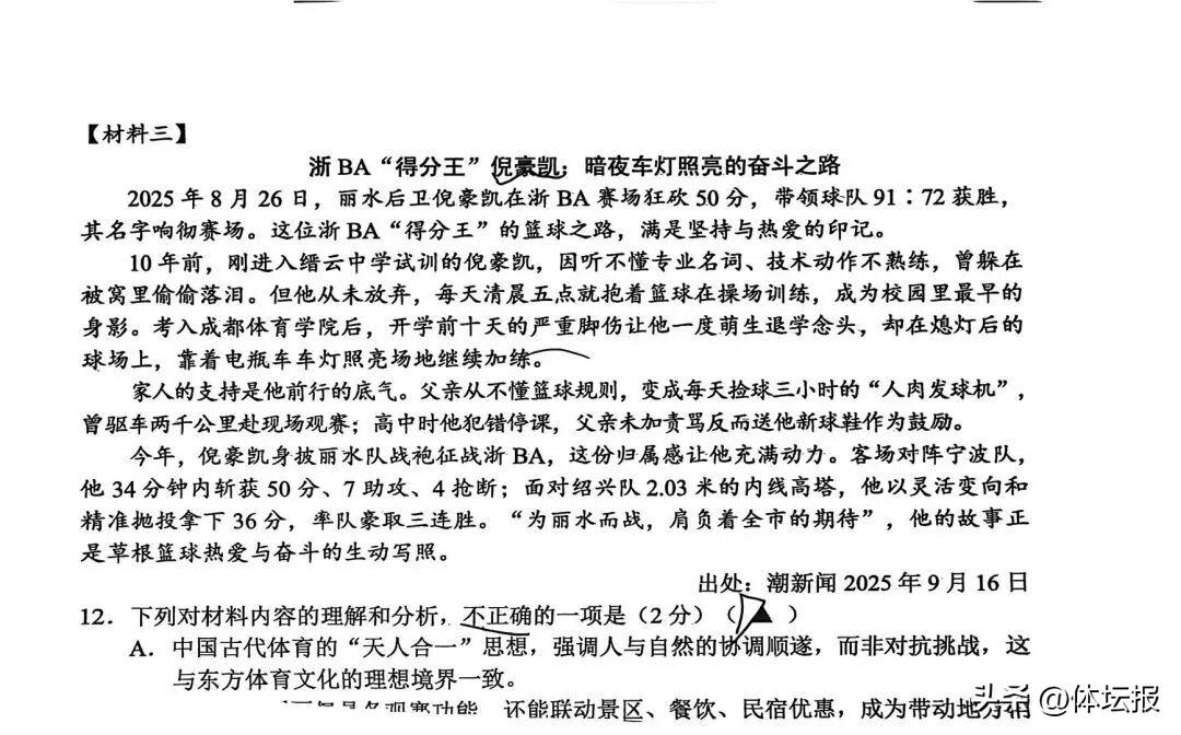 麗水地區的初中語文試卷將浙BA“得分王”倪豪凱的故事編入材料↓
