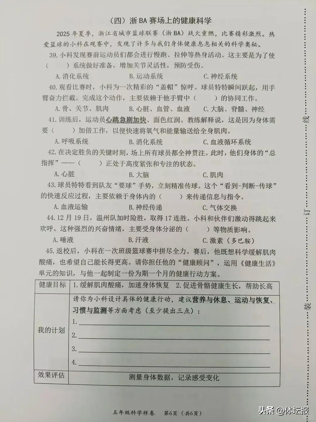 還有網友曬出一份溫州五年級的科學試卷,從浙BA球員賽場表現引申出與身體健康有關的科學題。浙BA以生活化、場景化的形式融入題目,讓考試也變得生動起來。