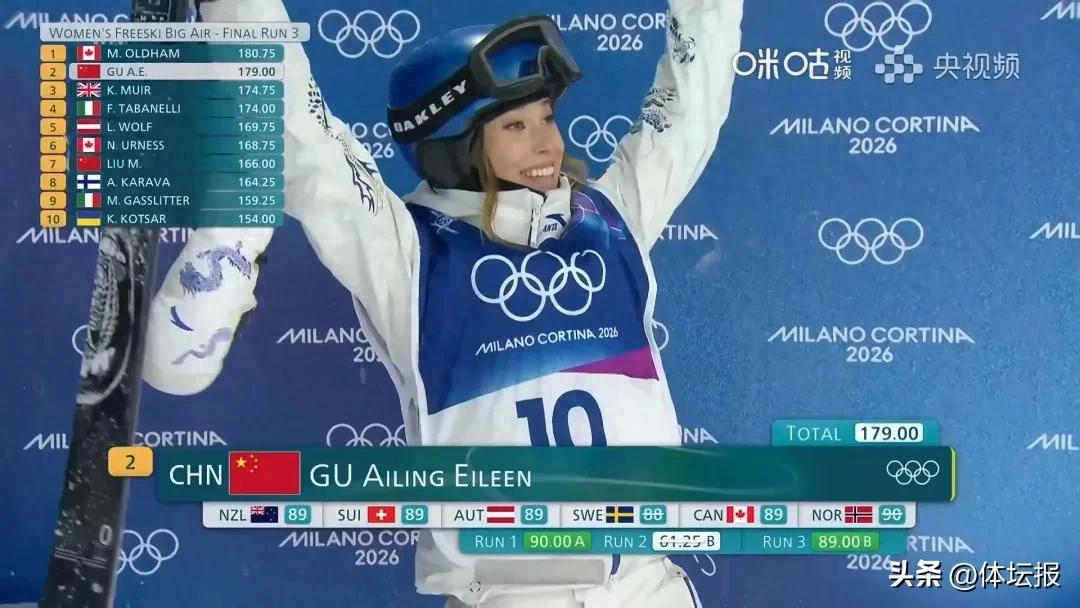 北京時間2月17日凌晨,米蘭冬奧會自由式滑雪女子大跳臺決賽,中國選手谷愛凌以179.00分摘得銀牌,另一位中國選手劉夢婷以166.00分取得第七名。