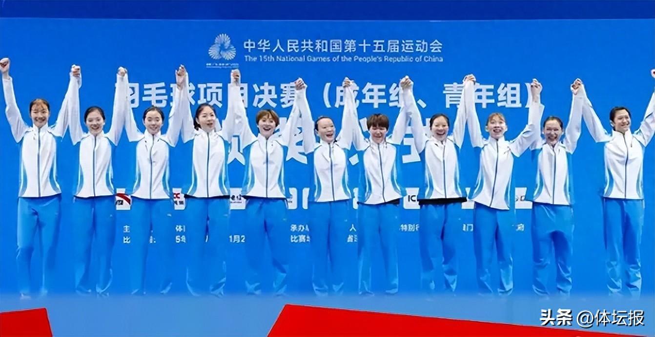 第十五屆全運會羽毛球團體項目,韓千禧(右五)隨隊獲得女團金牌(浙江體育資料圖)