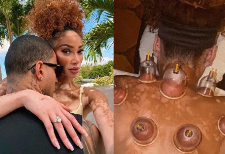 近日,NBA雄鹿隊的球星凱爾-庫茲馬,帶着未婚妻溫妮哈洛,又開啓了新一輪度假旅程,他在個人社交平臺曬出了兩人度假的照片,只見,在海島上,這位身患白癜風的超模,直接坐在庫茲馬的腿上,並且被緊緊抱着,畫面非常溫馨。有趣的是,溫妮哈洛還體驗了來自一種“東方的神祕力量”,那就是拔罐。