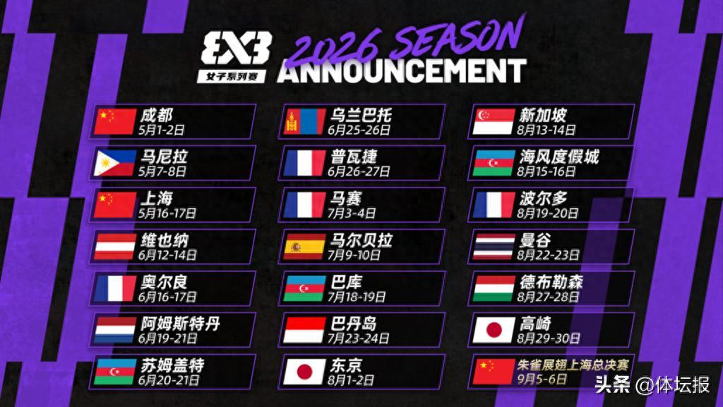 在亞洲揭開序幕後,2026賽季國際籃聯三人籃球女子系列賽將在6月進入賽程密集階段,跨越亞洲和歐洲的多個國家。