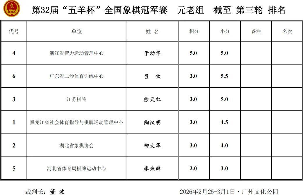 元老組三戰後,於幼華5分領先,呂欽、徐天紅、陶漢明、柳大華3分,李來羣2分。