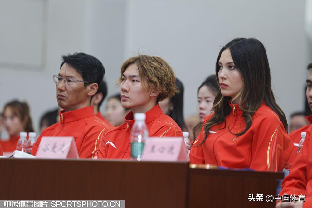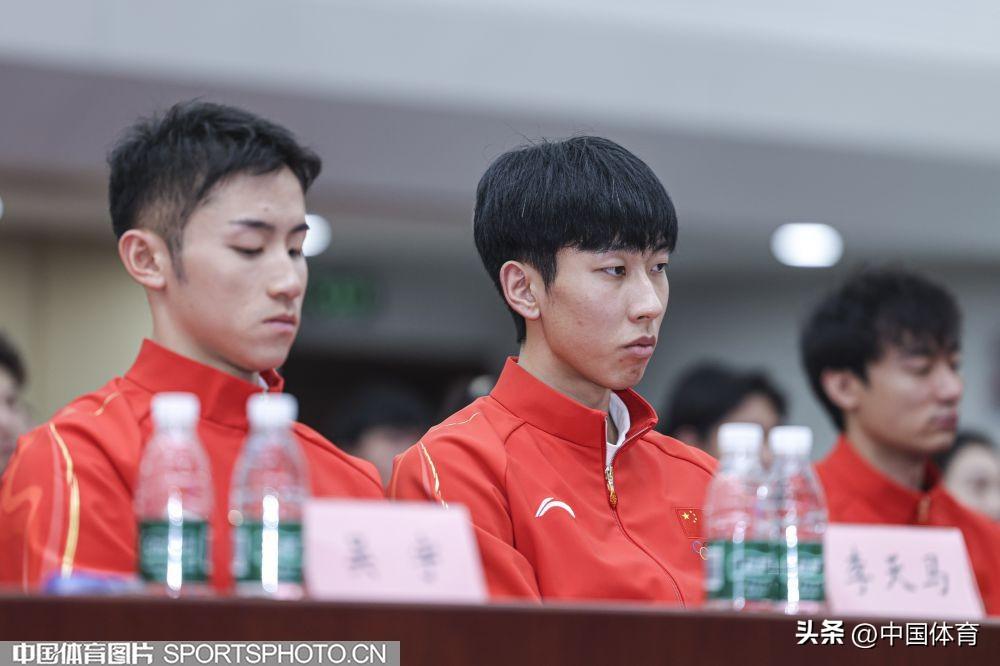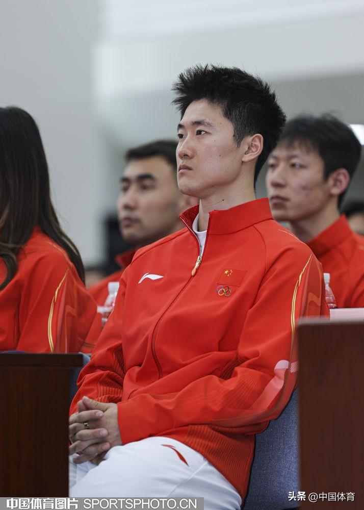 (左起)空中技巧隊主教練紀冬、單板滑雪運動員蘇翊鳴、自由式滑雪運動員谷愛凌