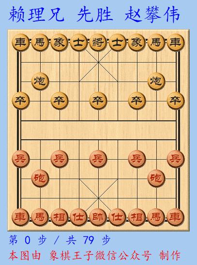 首局中,賴理兄執紅棋,過宮炮對挺7卒陣,拉開子力,全速搶佔場上高位,趙攀偉佈陣一個士6進5擋住本方車路線,是此喫虧。