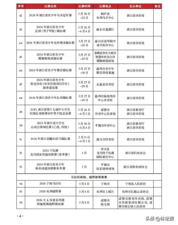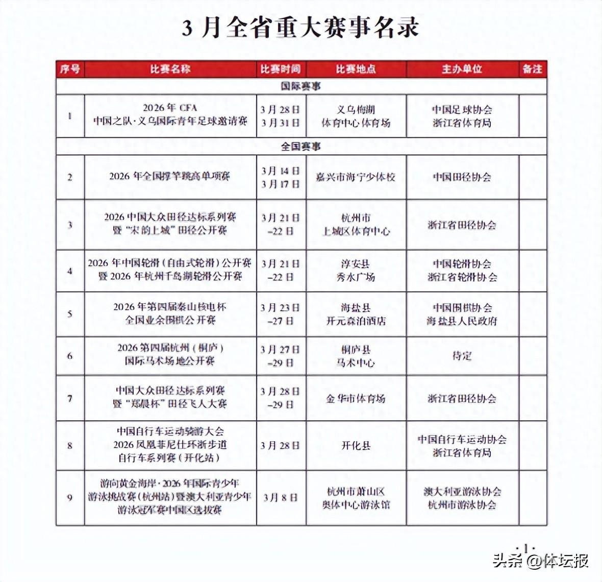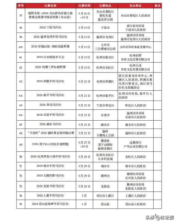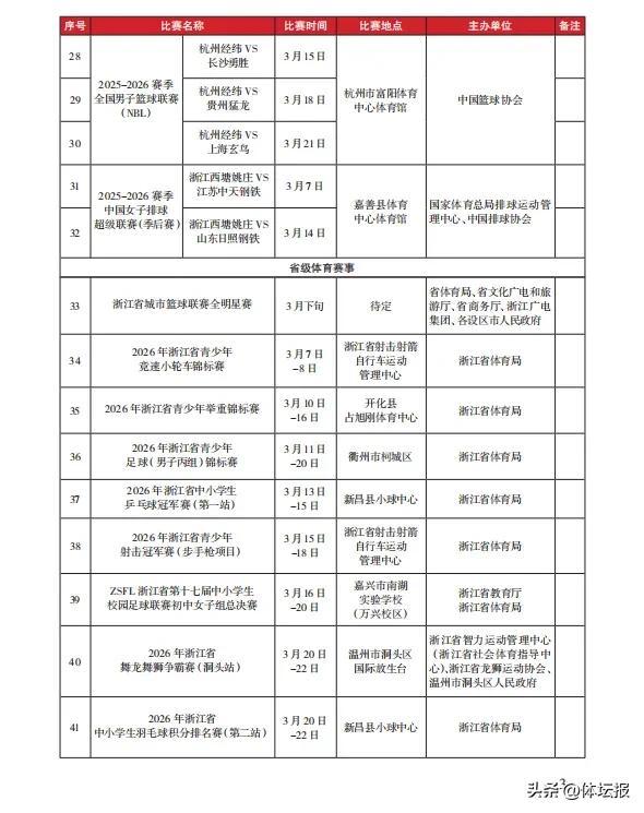 隨着3月氣溫逐漸轉暖體育賽事迎來“大爆發”本月全省重大賽事名錄已出爐其中1場國際賽事還有各類全國賽事CBA全明星週末落戶諸暨馬拉松路跑、越野跑等賽事三大球職業聯賽輪番上演還有大家非常關注的浙BA全明星賽即將登場一起來看看本月有哪些你心儀的賽事活動↓↓↓可點擊圖片放大查看來源:浙江省體育局訓練競賽處