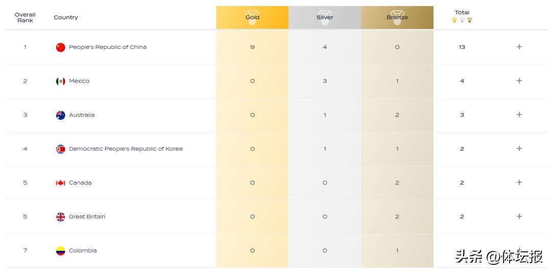 獎牌榜 圖自世界泳聯官網